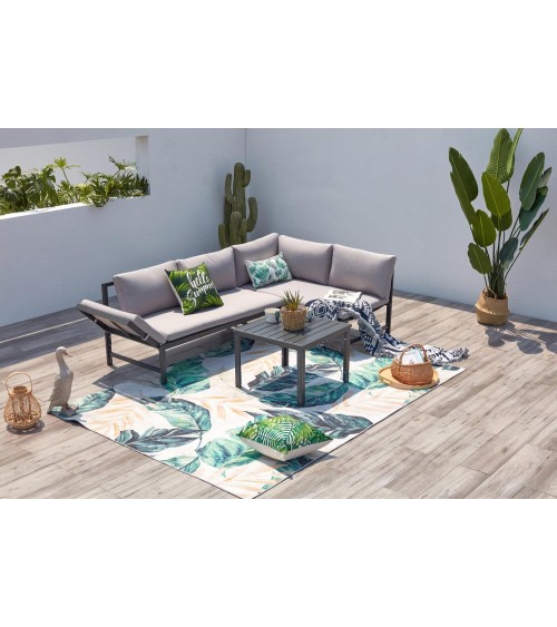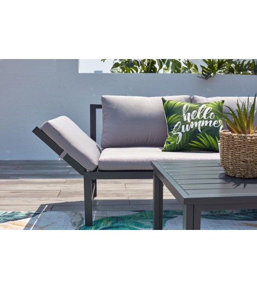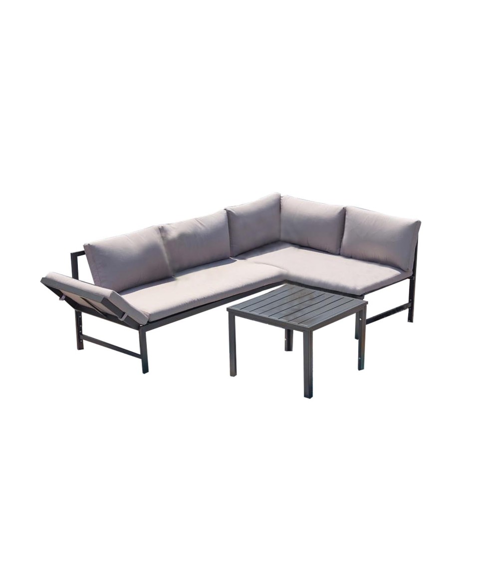 Salon de jardin bas gris clair avec canapé inclinableCe salon de jardin est composé de 2 canapés formant un angle, dont un est inclinable. Ce canapé inclinable vous permet de le modifier à votre convenance : Il peut vous servir d'assise lorsque vous recevez des convives, ou bien de dossier lorsque vous voulez vous allonger sur votre canapé. Adossé à ce dernier, vous pourrez alors vous détendre tout en profitant du soleil, ou bien lire un livre en vous accordant une pause lecture agréable ! Ce joli salon de jardin bas s'adaptera à tous les à tous les extérieurs, que ce soit sur votre terrasse ou dans votre jardin. Son design moderne saura se marier facilement avec les différents styles de décoration de jardin !Caractéristiques techniques :Nombre de places : 4Type de salon de jardin : DétenteCouleur principale : GrisForme de la table : CarréNombre de pieds : 4Canapé inclinable : OuiAvec coussin : OuiNombre de coussins : 8 (6 dossiers, 2 assises)Couleur des coussins : Gris clairMatière des coussins : PolyesterMatière structure : AcierGarnissage des coussins d'asssise : 90 % polyuréthane; 10% polypropylèneAssise déhoussable : OuiAvec zip : OuiNombre de couches de mousse : 3Densité de la mousse : 22DPoids maximum supporté par la table : 75 kgPoids maximum supporté par le canapé : 130 kgEntretien :Enlevez régulièrement la poussière avec un chiffon sec. Nettoyez et essuyez avec un chiffon humide. Protégez vos meubles en les recouvrant pendant les mois dhiver ou inutilisés p