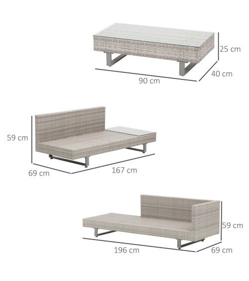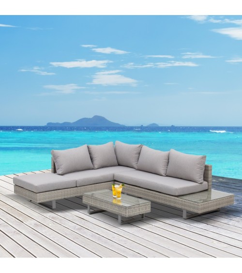 Mélant sobriété et élégance, ce salon de jardin d'angle 5 places design contemporain se démarque par son charme moderne et ses lignes simples. Grâce à son revêtement en résine tressée imitation rotin gris, ce canapé d'angle et sa table basse assortie vous permettront de créer un bel espace de détente chaleureux dans votre extérieur.Caractéristiques :- Salon de jardin d'angle 5 places design contemporain mélant sobriété et élégance pour sublimer votre extérieur- Ensemble salon de jardin d'angle 5 places 3 pièces : canapé 3 places, canapé 2 places, table basse- Armature et piètement haut de gamme en acier époxy anticorrosion robuste- Coussins d'assise et dossier déhoussables avec zip : entretien pratique et facile- Ensemble des coussins dotés d'un épais rembourrage mousse haute densité avec revêtement en tissu polyester haute densité 205 g/m² déperlant- Assises larges, profondes, dossiers hauts : confort d'assise inégalable idéal pour discuter entre amis, se reposer, prendre le soleil, etc...- Extrémité méridienne avec plateau en verre trempé : touche de raffinement supplémentaire, utile pour placer verres, magazines- Table basse assortie avec plateau verre trempé offrant plus de caractère et convivialité au salon- Pieds de nivellement antidérapants : stabilité optimale, aucun risque de rayure de votre sol- Recommandation : veuillez utiliser une housse pour le protéger si inutilisationSpécifications :- Couleur : gris- Matériaux principaux : acier époxy, polyester, garnissage mousse- Dim. canapé 2 places : 167L x 69P x 59H cm- Dim. canapé 3 places : 196L x 69P x 59H cm- Dim. table basse : 90L x 40P x 25H cm- Dim. assise canapé 2 places (sans coussin) : 127L x 60P x 26H cm- Dim. assise canapé 3 places : 188L x 60P cm x 26H cm- Hauteur accoudoirs : 59 cm- Dim. coussins assises : 127L x 60P cm, 62L x 68P cm (ép. : 9 cm)- Charge max. reco. : 30 Kg (table),160 Kg (par place)- Livraison effectuée en 1 colis- Réf. : 860-143