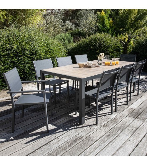 Produit à usages professionnels et particuliers - Laissez-vous séduire par la table de jardin Tivoli et son look à la fois moderne et naturel. Son plateau en lattes de céramique est agréable au toucher et imite à la perfection l'aspect du bois tout en étant plus résistant et facile d'entretien. La structure du piétement est en aluminium. Suffisamment grande pour accueillir jusqu'à 10 personnes, la table de jardin aluminium et céramique est un mobilier design de choix pour des repas de famille dans la maison ou sur la terrasse. Caractéristiques de la table de jardin Tivoli :Table rectangulaire Plateau en lattes de céramique imitation bois Structure en aluminium Facile à entretenir Résiste aux moisissures Notice et visseries fournies pour le montage des piedsDimensions de la table de jardin Tivoli : Longueur : 206 cm Largeur : 100 cm Hauteur : 74,5 cmColis3 cartons Poids de la table: 36 kg
