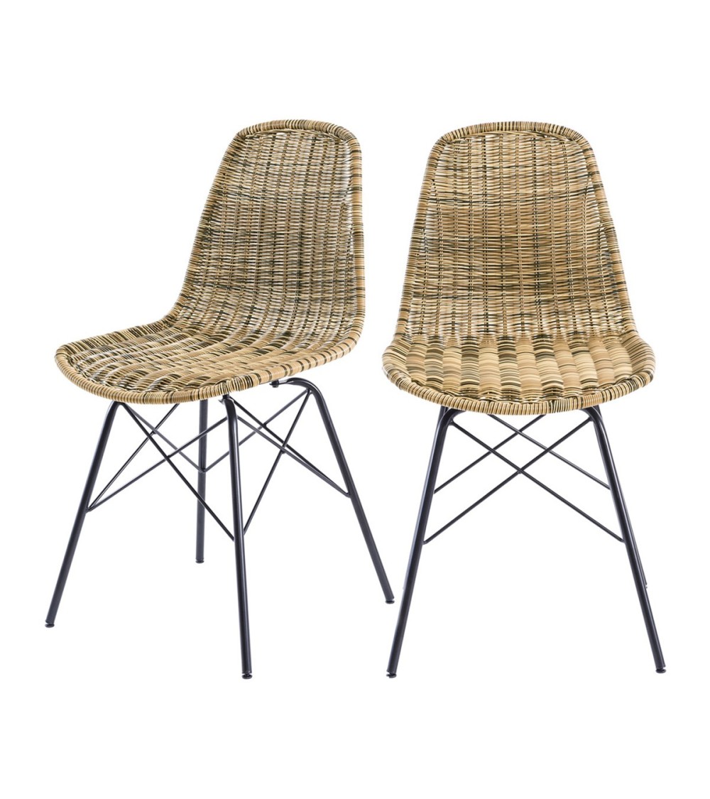 Poids : 4.75kg Dimensions: - Longueur : 45 cm- Largeur : 53 cm- Hauteur : 84 cm- Hauteur d'assise : 46.5 cm- Assise : 42 x 37 cmEntretien : Nettoyer à l'aide d'une éponge imbibée d'eau tiède imprégnée de savon de Marseille et bien essoréeMateriaux : Structure en métalAssise et dossier en résine tresséeMontage : Pieds à assembler, notice incluseContenu : Vendues par lot de 2Informations : Usage intérieur et extérieurPoids max : 150 kgInformations colis : 54 x 47 x 65 cm
