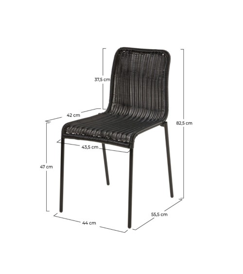 Poids : 4.2kg Dimensions: - Longueur : 45 cm- Profondeur : 55.5 cm- Hauteur : 82.5 cm- Largeur d'assise : 43.5 cm- Profondeur d'assise : 42 cm- Hauteur d'assise : 47 cm- Hauteur du dossier : 37.5 cm- Largeur du dossier : 34.5 cmEntretien : Pour nettoyer la surface de la chaise en résine tressée, utiliser une éponge imbibée d'eau tiède et de savon de Marseille.Materiaux : Structure en métal Assise et dossier en résine tresséeMontage : Pieds à assembler, notice incluseInformations : - Poids max : 150 kgs- Pour l'intérieur et l'extérieur- EmpilableInformations colis : 47 x 59 x 87 cm