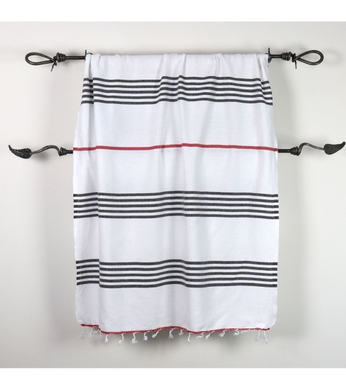 Fouta 100% coton rayures marines et rouges, sobres et classiques, l'élégance en toute circonstances. Elle remplace la serviette de bain en éponge en étant plus lègère et absorbante.Simple et élégante, la fouta est un drap de bain tendance et chic, idéal pour la plage, le spa, le hammam, ...Conseils d'entretien de la fouta :Faites tremper votre fouta dans de leau froide avant le premier lavage.Un lavage à 30°C est préférable.Pour que votre fouta gagne en souplesse et douceur, lavez-la régulièrement.