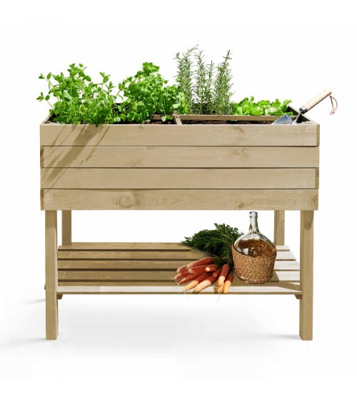 Ce potager en bois FSC rectangulaire sur pieds sera le parfait allié des jardiniers en herbe ou en manque d'espace grâce à ses dimensions avantageuses (Longueur 110cm x Profondeur 50cm x Hauteur 80cm). Fabriqué pour éviter que vous ayez à vous baisser, il vous permettra de faire pousser herbes, fruits et légumes facilement, qu'importe l'espace disponible dans 4 larges compartiments. Equipé d'une tablette basse qui pourra accueillir vos outils de jardin, ce rectangle potager en bois de pin naturel trouvera parfaitement sa place sur vos terrasses et balcons. Existe en deux teintes : Gris Anthracite et Bois Naturel Dimensions Potager : Longueur 110cm x Profondeur 50cm x Hauteur 80cm Pieds : 40x40mm Epaisseur du bois : 12mm Planche inférieur : Hauteur 17cm Bac intérieur : Longueur 97,5cm x Profondeur 47,5cm x Hauteur 28cm Bac extérieur : Longueur 100cm x Profondeur 50cm x Hauteur 31,5cm Matière Bois de pin naturel FSC 4 compartiments Montage A monter soi-même La visserie est fournis Existe en 2 coloris Bois naturel, Gris anthracite Garantie Garantie 2 ans sous respect des règles de montage et d'utilisation