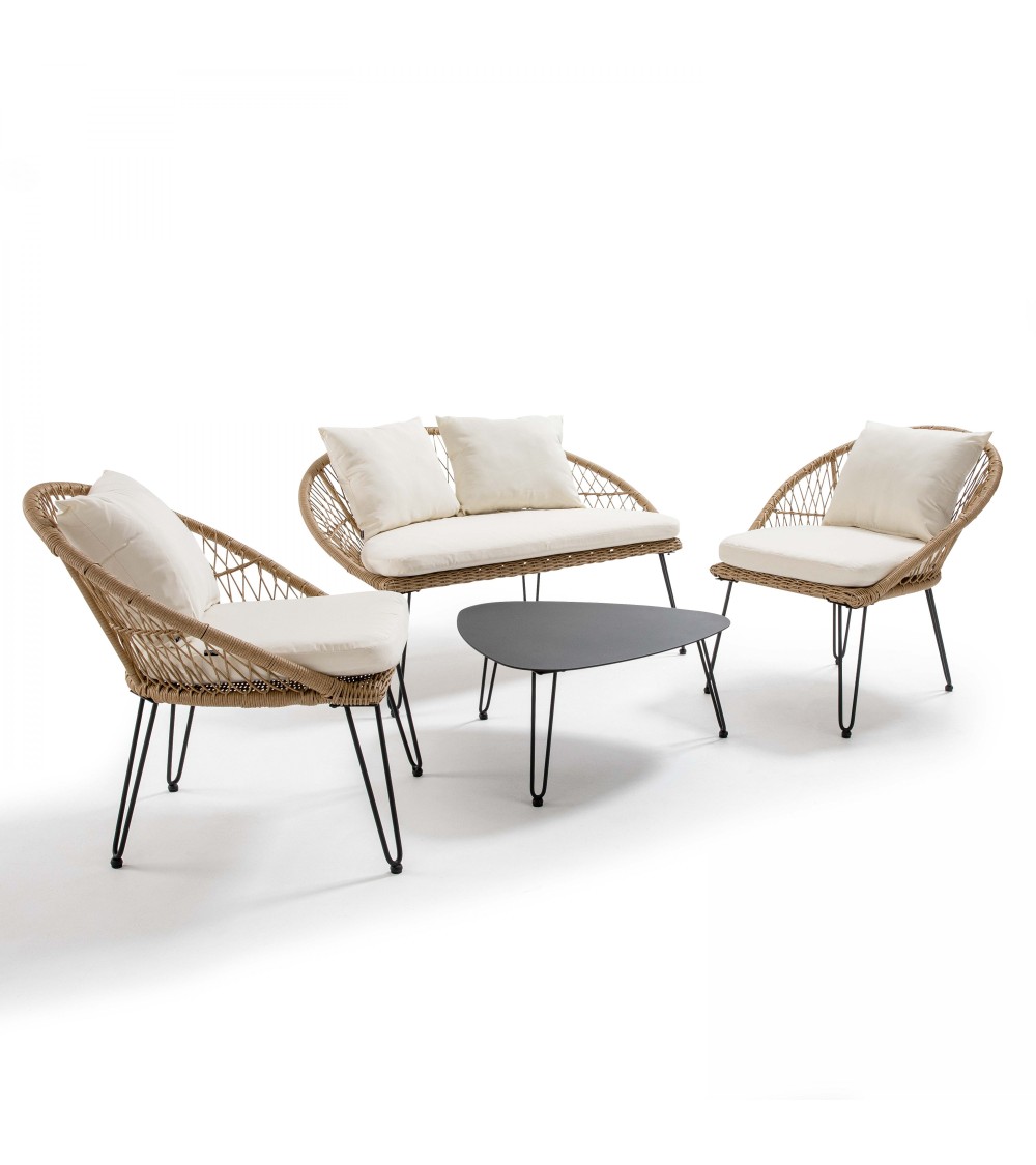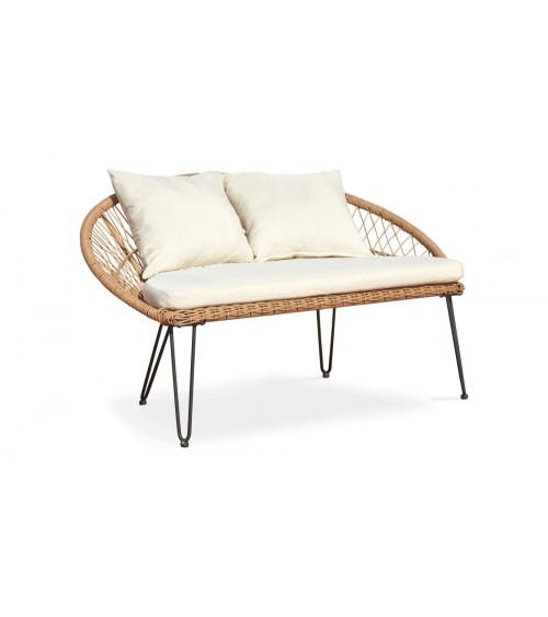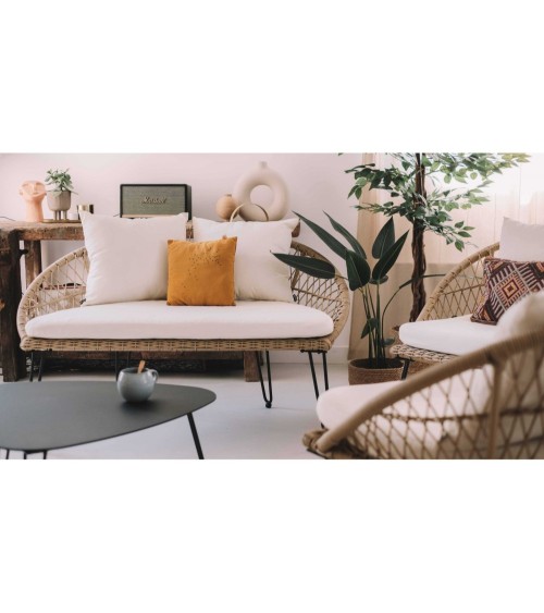 Avec son imitation rotin, le salon Bora Bora apporte une touche tendance et chaleureuse à votre décoration d'intérieur. Les fils de résine, couleur naturelle, tissés à la main imitent à la perfection le rotin. Le salon Bora Bora avec ses assises profondes, ses dossiers légèrement inclinés, ses coussins (assise + dos) sont une véritable invitation à la paresse. Le salon de jardin BORA BORA s'entretient facilement: acier et fils de résine se nettoient avec une éponge ou un chiffon doux et un peu d'eau savonneuse. Canapé et fauteuils sont livrés montés. La table d'appoint est à assembler (vis et manuel de montage fournis).Description du salon:Canapé 2 places + Coussins assise et dos2 fauteuils + 2 coussins assises et 2 coussins dos1 table basse en aluminiumCaractéristiques du canapé:Canapé: Largeur 138 cm x Profondeur 88 cm x Hauteur 80 cm - Hauteur de l'assise 45 cmCoussin assise: Largeur 118 cm x Profondeur 59 cm x épaisseur 8 cmCoussin dossier: Largeur 88 cm x Hauteur 43 cm x Epaisseur 10 cmStructure en acier - Assise en résine tressée imitation rotin15 kgCaractéristiques des fauteuils:Fauteuils: Largeur 81 cm x Profondeur 83 cm x Hauteur 80 cm - Hauteur de l'assise 45 cmCoussin assise: Largeur 56 cm x Profondeur 60 cm x épaisseur 8 cmCoussin dossier: Largeur 50 cm x Hauteur 45 cm x Epaisseur 10 cmStructure en acier - Assise en résine tressée imitation rotin9,1 kgDimensions de la table basse:Table basse: Longueur 76 cm x Profondeur 74 cm x Hauteur 37 cmEpaisseur du plateau 6 mmPlateau en aluminiumPieds en acier traités anti-corrosionColis:Table: 6 kgCanapé: 15 kgFauteuil: 9,1 kg