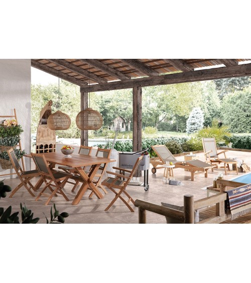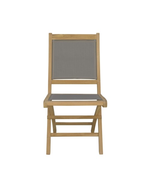 Chaise de la collection JARDIN, créée spécifiquement pour lextérieur. Fabriquée en bois de teck massif et tissu gris. Pliante, parfaite pour la garder une fois la saison terminée. Mesures de la chaise pliée : 46cm large x 13 cm profondeur x 110cm hauteur. Hauteur de l'assise 68cm