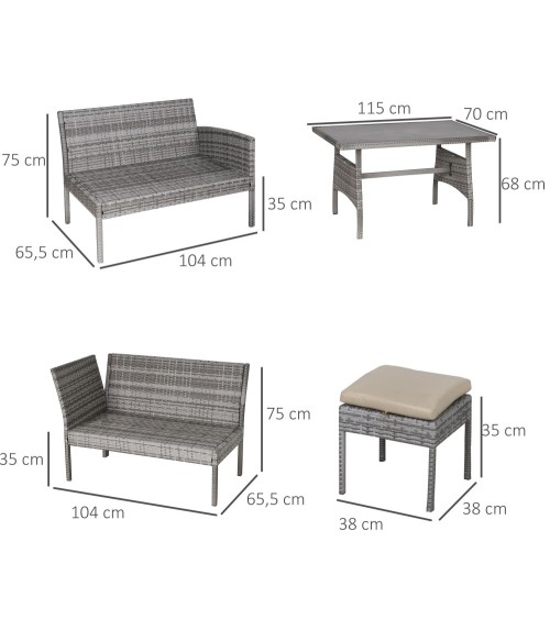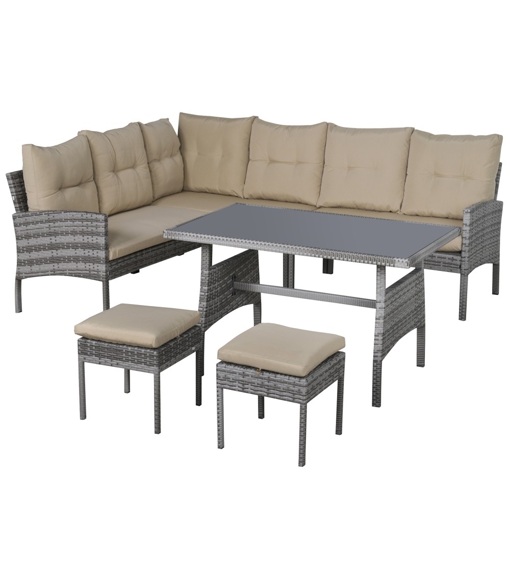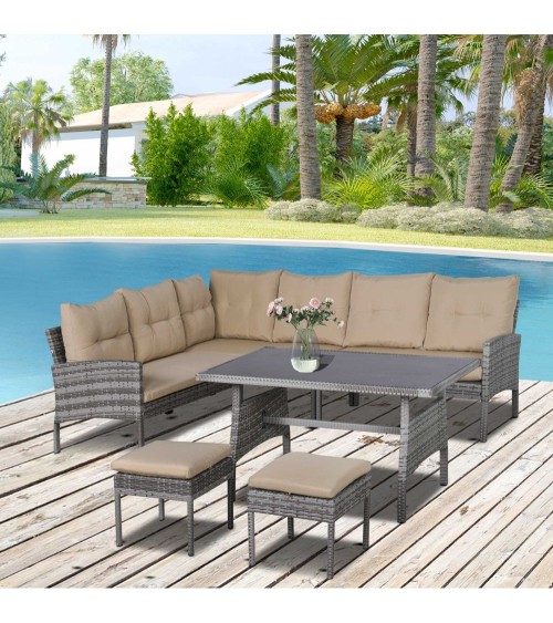 Aimez-vous vivre la nature ? Souhaitez-vous un grand salon de jardin d'angle en réponse à votre goût pour l'élégance et la modernité ? Alors optez pour ce magnifique ensemble salon de jardin 6 personnes en résine tressée qui sublimera votre extérieur. De quoi confortablement installer et épater votre famille et amis !Caractéristiques : - Ensemble salon de jardin complet doté d'un total de 6 pièces : 3 canapés (droite, gauche, centre), 1 grande table à manger et 2 poufs repose-pieds- Style cosy chic en résine tressée grise avec coussins beige mêlant élégance, fraicheur, sobriété- S'intègre parfaitement à tout type d'extérieur : terrasse, jardin, patio, véranda, etc.- Ensemble des coussins fournis garnissage mousse haute densité grand confort : 3 coussins d'assise, 7 coussins de dossier- Revêtement polyester déperlant de chaque coussin : rembourrage mousse préservé de l'humidité pour un séchage rapide (coussins zippés déhoussables)- Revêtement salon en résine tressée imitation rotin : matériau de qualité résistant aux rayons UV, à l'humidité et ne nécessitant pas d'entretien particulier- Structure robuste en métal époxy anticorrosion : usage pérenne- Grand plateau de table à manger en verre trempé Spécifications : - Couleurs principales : gris, beige- Matériaux principaux : métal époxy, résine PE, verre trempé, polyester- Dim. canapés d'angle : 104L x 65,5P x 75H cm- Dim. canapé intermédiaire : 112L x 65,5P x 75H cm- Dim. repose-pied : 38L x 38P x 35H cm- Dim. table : 115L x 70l x 68H cm- Dim. assise canapés d'angle (sans coussin) : 100L x 54P x 35H cm- Dim. assise canapé inter. (sans coussin) : 100L x 54P x 35H cm- Ép. coussin assise : 6 cm- Ép. coussin dossier : 8 cm- Charge max. recommandée : 320 Kg (canapés), 160 Kg (repose-pieds), 70 Kg (table basse)- Livraison effectuée en 3 colis- Réf. : 860-135