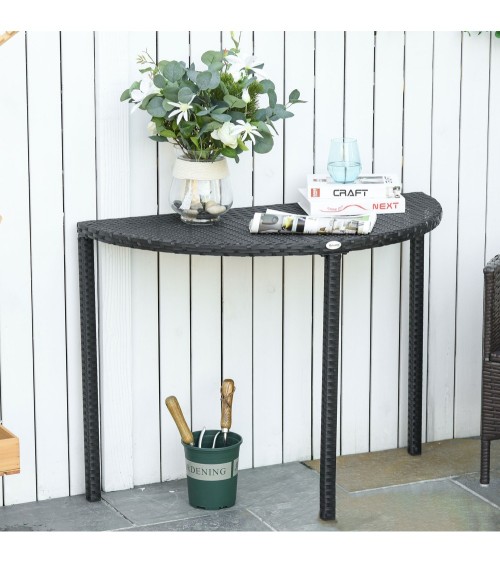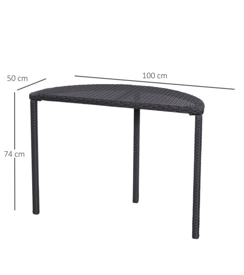 Cette superbe table demi-lune pour balcon ou jardin va vous rendre la vie plus agréable ! Très pratique et pouvant accueillir 3 à 4 personnes, vous n'aurez plus besoin d'encombrer votre balcon avec une grande table.Caractéristiques :- Table demi-lune de balcon ou jardin style cosy chic en résine tressée 4 fils imitation rotin mélant sobriété et élégance- Grande adaptabilité à la plupart des balcons, installation également possible dans votre jardin contre un mur afin d'optimiser votre espace libre disponible- Table grande taille dim. 100L x 50l x 74H cm doté de 3 pieds : idéale pour déjeuner, diner, ou prendre un verre confortablement à 3 ou personnes maximum- Structure robuste en métal époxy anticorrosion avec revêtement de qualité en résine PE : charme du rotin sans ses contraintes d'entretien et usage pérenne- Montage facile, rapide à l'aide du manuel d'assemblage illustré fourniSpécifications :- Couleur : noir- Matériaux principaux : métal époxy, résine PE- Dim. totales : 100L x 50l x 74H cm- Charge max. recommandée : 75 Kg- Livraison effectuée en un colis- Réf. : 867-029