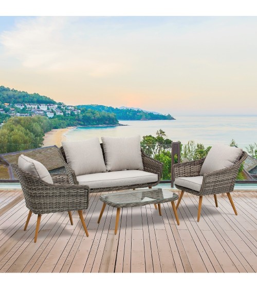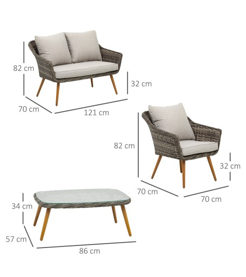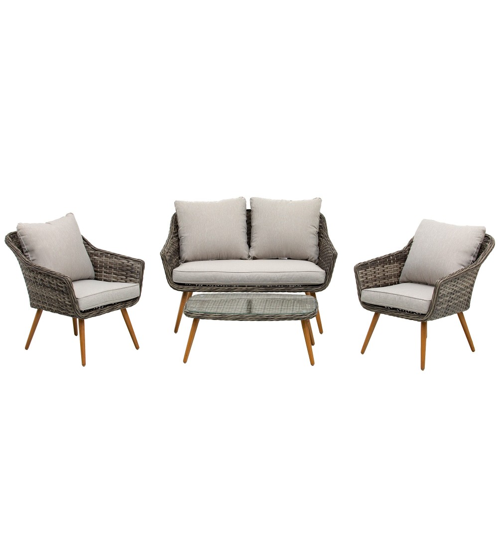 Aimez-vous vivre la nature ? Alors optez pour ce magnifique ensemble salon de jardin 4 personnes design scandinave fabriqué en résine de polyéthylène imitation rotin avec pieds effilés aspect bois. Ce modèle vous apportera un peu de dépaysement en se rapprochant au plus près des matières naturelles tout en garantissant résistance face aux conditions extérieures. C'est l'ensemble de jardin idéal pour créer un espace détente ultra tendance.Caractéristiques : - Ensemble salon de jardin complet doté d'un total de 4 pièces : 2 fauteuils, 1 canapé 2 places, 1 table basse aux belles lignes arrondies- Design scandinave dans un joli camaieu de gris avec pieds effilés, inclinés aspect bois idéal pour sublimer votre extérieur- Revêtement résine tressée imitation rotin mêlant sobriété et élégance au naturel- Structure robuste en métal époxy anticorrosion et résine de polyéthylène : matériaux de qualité résistant aux rayons UV, à l'humidité et ne nécessitant pas d'entretien particulier- Coussins d'assise et dossier grand confort fournis (revêtement polyester, garnissage mousse haute densité)- Assise profonde, dossier ergonomique, accoudoirs : grand confort d'utilisation- Entretien facile et pratique : plateau table basse en verre trempé épaisseur 5 mm, coussins d'assise zippés déhoussables- Idéal pour une installation aussi bien extérieure (jardin, terrasse, balcon) qu'intérieure (véranda) Spécifications : - Couleurs principales : gris- Matériaux principaux : métal époxy, résine tressé PE, tissu polyester, garnissage mousse- Dim. canapé 2 places : 121L x 70P x 82H cm- Dim. fauteuils : 70L x 70P x 82H cm- Dim. table basse : 86L x 57l x 34H cm- Dim. assise canapé 2 places : 106L x 56P cm (épaisseur : 7 cm)- Dim. assise fauteuil (sans coussin) : 55L x 56P x 32H cm- Dim. coussins d'assise : 55L x 50l cm- Charge max. recommandée : 220 Kg (canapé), 160 Kg (fauteuils), 30 Kg (table basse)- Livraison effectuée en 1 colis- Réf. : 860-119
