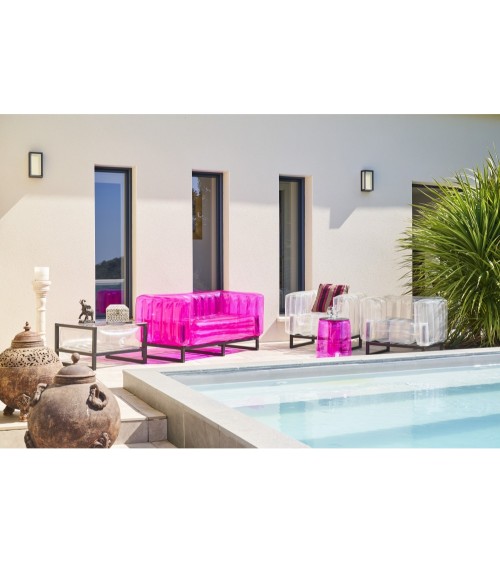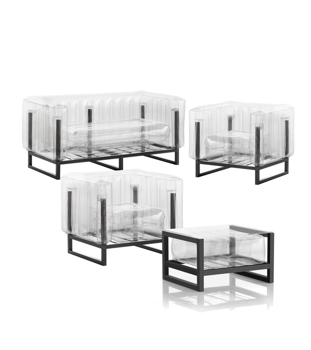 Produit à usages professionnels et particuliers Salon de jardin moderne au design français intemporel, produit en matériaux hyper résistants et éco-responsables, le style épuré et fun de votre salon de jardin Yomi Eko trouvera aisément sa place au bord de la piscine ou sur votre terrasse. Assemblez les fauteuils, canapés et tables basses d'extérieur Mojow, pour créer votre salon de jardin design moderne, élégant et original.Dimensions : Canapé: 151x76,5x69,5cm / Poids: 14,3 kg - Fauteuil: 83x76,5x69,5 cm / Poids: 9,6 kg - Table basse: 40x72x62 cm / Poids: 11,5 kg.TPU : Nouvelle matière recyclable et biodégradable, inodore et ne contenant pas de chlore. Le TPU est une matière « froide ». Les modèles transparents ont la particularité de laisser passer les rayons du soleil, ce qui permet de ne pas sy brûler lorsquils sont exposés en plein soleil !Entretien facile: Nettoyer à l'eau savoneuse. Pas de produit chimique. Produits livrés démontés dans de petites valises très facile à transporter et à stocker. Une pompe est offerte à chaque commande.Les points forts :* Ideal en intérieur comme en extérieur* Très facile et rapide à monter / ranger* Facile d'entretien* Ne chauffe pas avec le soleilCe mobilier gonflable Design est très léger et peut se déplacer facilement ce qui sera parfait pour équiper vos bureaux, vos halls d'entrées ou bien même apporter une touche Fun et Coloré pour vos évenements.Seulement quelques barres à assembler, un matelas à gonfler et vous voila prêt à profiter de votre Mojow.Structure : Aluminium noirMatelas gonflable : TPU (éco-responsable et biodégradable)Hauteur d'assise : 41cm