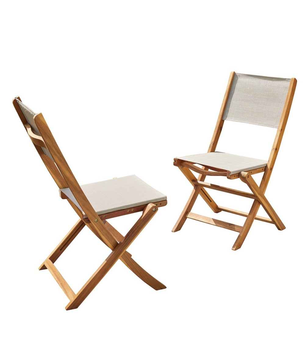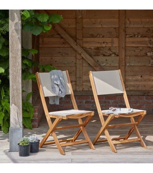 Ces chaises en bois bois d'acacia et textilène sont très tendances et résistantes. L'assise et le dossier sont en textilène gris, ce qui apporte une touche de modernité et de douceur. Un mix de matière résolument tendance et actuel qui donnera du peps à votre jardin ! Ces chaises sont pliantes. Elles permettent de les stocker facilement lorsque vous ne souhaitez plus les utiliser ou tout simplement pendant la saison hivernale. Caractéristiques : Matière : Acacia et textilène - Couleur : Naturel et gris - Hauteur : 90 cm - Profondeur : 58 cm - Largeur : 50 cm - Poids : 8 kg - Garantie : 2 ans - Montage : Livré monté. Les + : Pliantes Bois d'acacia.