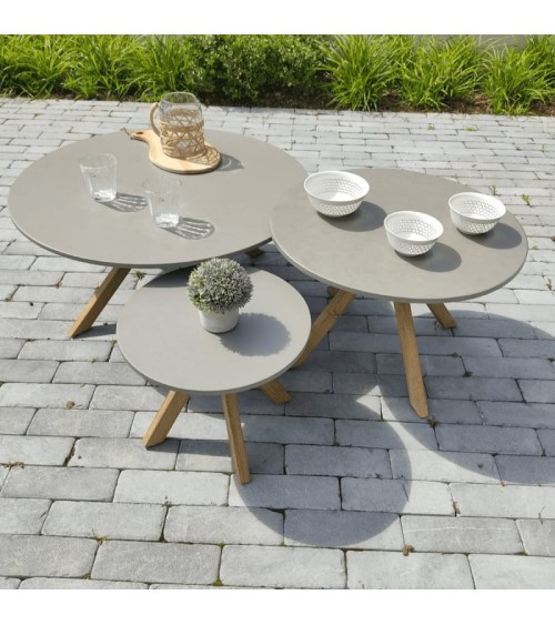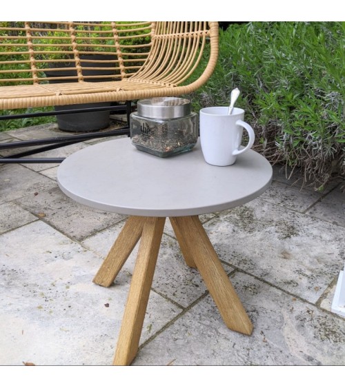 Table basse de jardin ronde diamètre 40 cm Lagos. Idéale en table d'appoint de jardin à côté de votre transat ou bien en table basse de jardin. Dimensions : diamètre 40 x H30 cm. A monter soi-même. Plateau couleur gris clair. Matières : pieds en bois deucalyptus et plateau en fibre de ciment. Garantie 5 ans.
