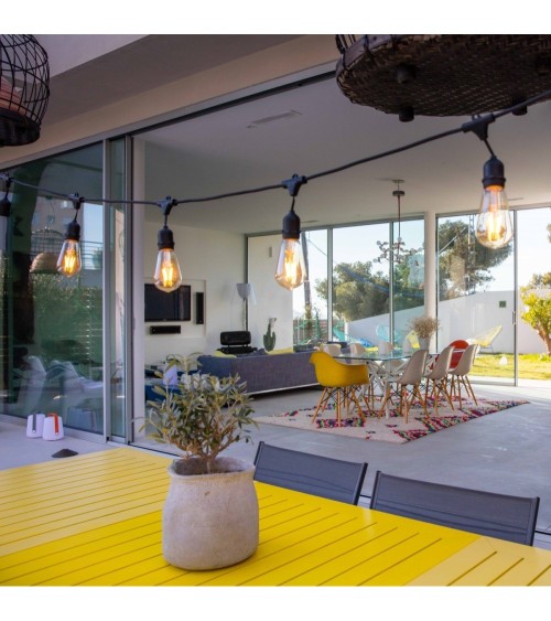 Cette guirlande de style industriel PYLA va insuffler un air bohème et chaleureux à votre espace extérieur ! Avec 10 douilles à ampoules dénudées PVC noir, complètement étanche aux projections d'eau grâce à son indice de protection IP44, cette guirlande d'extérieur de 7 mètres de longueur va illuminer votre jardin d'été dans un élan poétique. Si vous avez envie de créer une véritable atmospgère gypsy, optez pour des ampoules de style vintage à filament. Vous pouvez l'accrocher au mur de votre terrasse en positionnant le fil avec des crochets, ou la faire courir le long d'un salon de jardin au niveau du dossier. Elle s'intègre également parfaitement aux terrasses et balcons. Elle diffusera une lumière douce et tamisée pour enchanter vos soirées d'été. Ce luminaire est compatible avec 10 ampoules E27 de 40 watts de puissance. Ampoules incluses. Les plus du produit : Eclairage LED - Matériau résistant - 100% étanche Caractéristiques : - Douille : E27 - Puissance : 40W - IP : 44 - Matière : pvc_synthetic