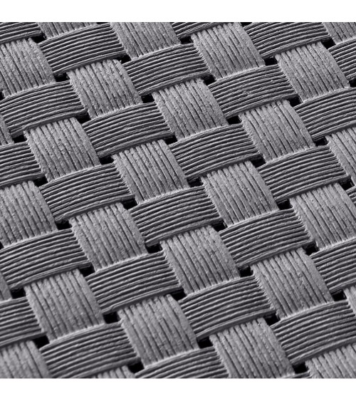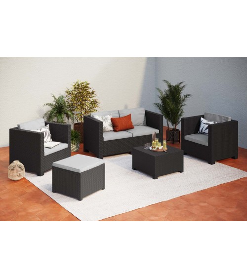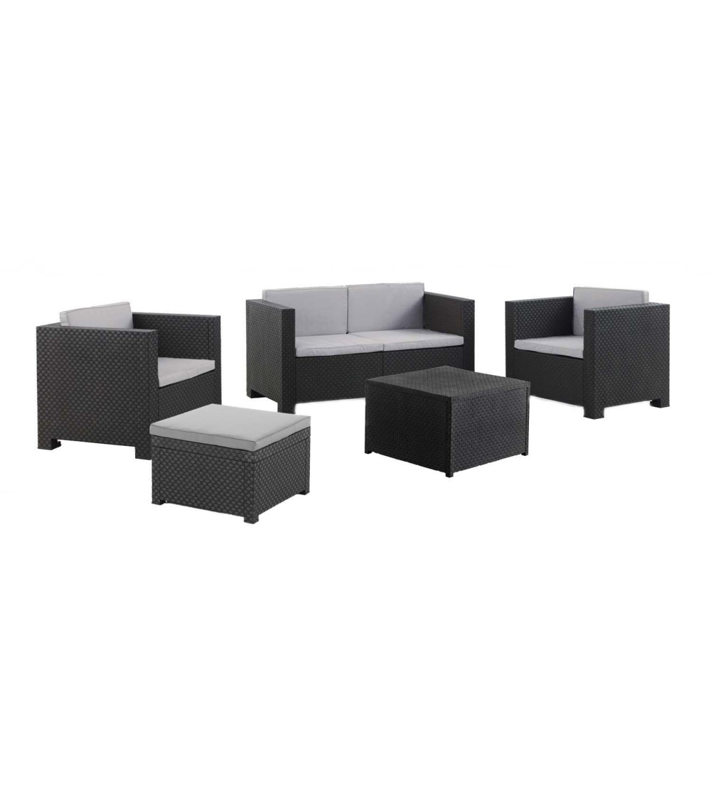 Salon de jardin en résine tressée ronde 5 placesProfitez de votre extérieur grâce à ce joli salon de jardin 5 places. Sa résine tressée ronde lui donne un aspect rotin naturel qui ajoutera à coup sûr du charme à votre jardin ! Vous pourrez accueillir tous vos convives grâce à cet ensemble composé d'un canapé 2 places, de 2 fauteuils et d'un pouf supplémentaire. Ce salon est composé à 80% de résine recyclée. Cette matière est prônée des salons de jardin car elle a pour spécificité de résister durablement aux intempéries et se nettoie très facilement. Dôté de coussins sur chaque assise et chaque dossier, ce salon Ankara vous promet d'être confortablement installés sur ces coussins de 6 cm d'épaisseur et de densité de 18kg/m3. Pratiques, ces coussins sont totalement déhoussables, ce qui vous permet de les passer à la machine.N'hésitez plus, ce salon de jardin fabriqué en Espagne sera idéal pour passer des instants conviviaux entre amis ou en famille !L'ensemble est composé de :1 canapé 2 places2 fauteuils 1 pouf1 tableCaractéristiques techniques :Nombre de places : 5Couleur : résine injectée grise, coussins grisArmature en polypropylèneCoussins déhoussables lavables en tissu déperlantDensité des coussins : 18kg/m3Assise confortable et résistante à l'eau80% en matière recycléeSans composants métaliques pour éviter la rouilleFabriqué en EspagneDimensions :Canapé : 132 x