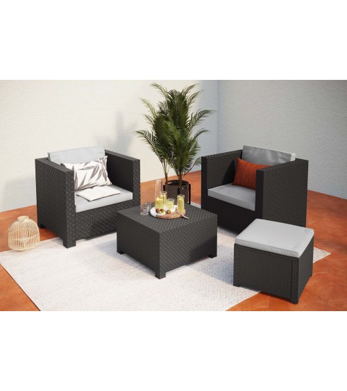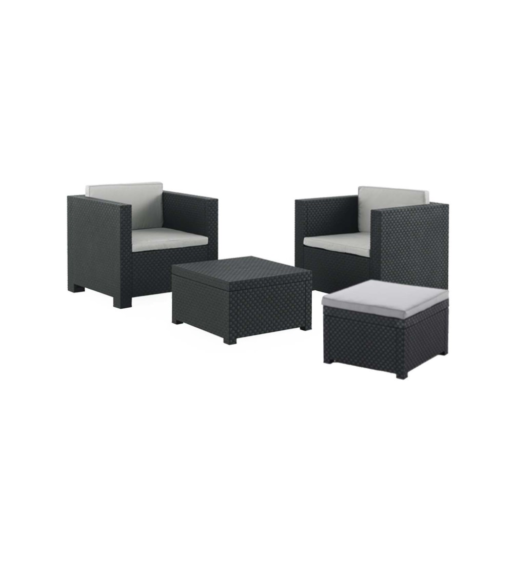 Le salon de jardin 3 places Ankara s'adapte tout aussi bien à une utilisation extérieure qu'intérieure grâce à sa composition en résine injectée. Cet ensemble fabriqué en Espagne est fabriquée en résine recyclée sans composants métalliques afin d'éviter tout problème de rouille et facilite son entretien. Il est doté dune assise confortable et résistante à leau grâce à des coussins déhoussables, lavables et en tissu déperlant. Intemporel et design, ce salon de jardin en résine tressée comprend également une table basse et un pouf, idéal pour recevoir vos convives pour des moments chaleureux !Ensemble composé de2 fauteuils1 pouf 1 table basseCaractéristiques techniques : Nombre de places : 3Couleur : résine injectée anthracite, coussins gris100% résine, sans composants métalliques Armature en polypropylèneCoussins déhoussables lavables en tissu déperlantDensité des coussins : 18kg/m3Assise confortable et résistante à l'eauProtection contre la pluie et contre UV Fabriqué en EspagneDimensions : Fauteuils : 74 x 66 x 72 cmTable basse : 57x 57 x 34 cmPouf : 56 x 56 x 39 cmEpaisseur des coussins : 6 cmLargeur des accoudoirs : 8 cmConseils d'entretien : Pour un entretien optimal de votre mobilier en résine injectée, nous vous conseillons tout simplement de le laver au jet d'eau. Les coussins sont lavables en machine à 40°C, essorage