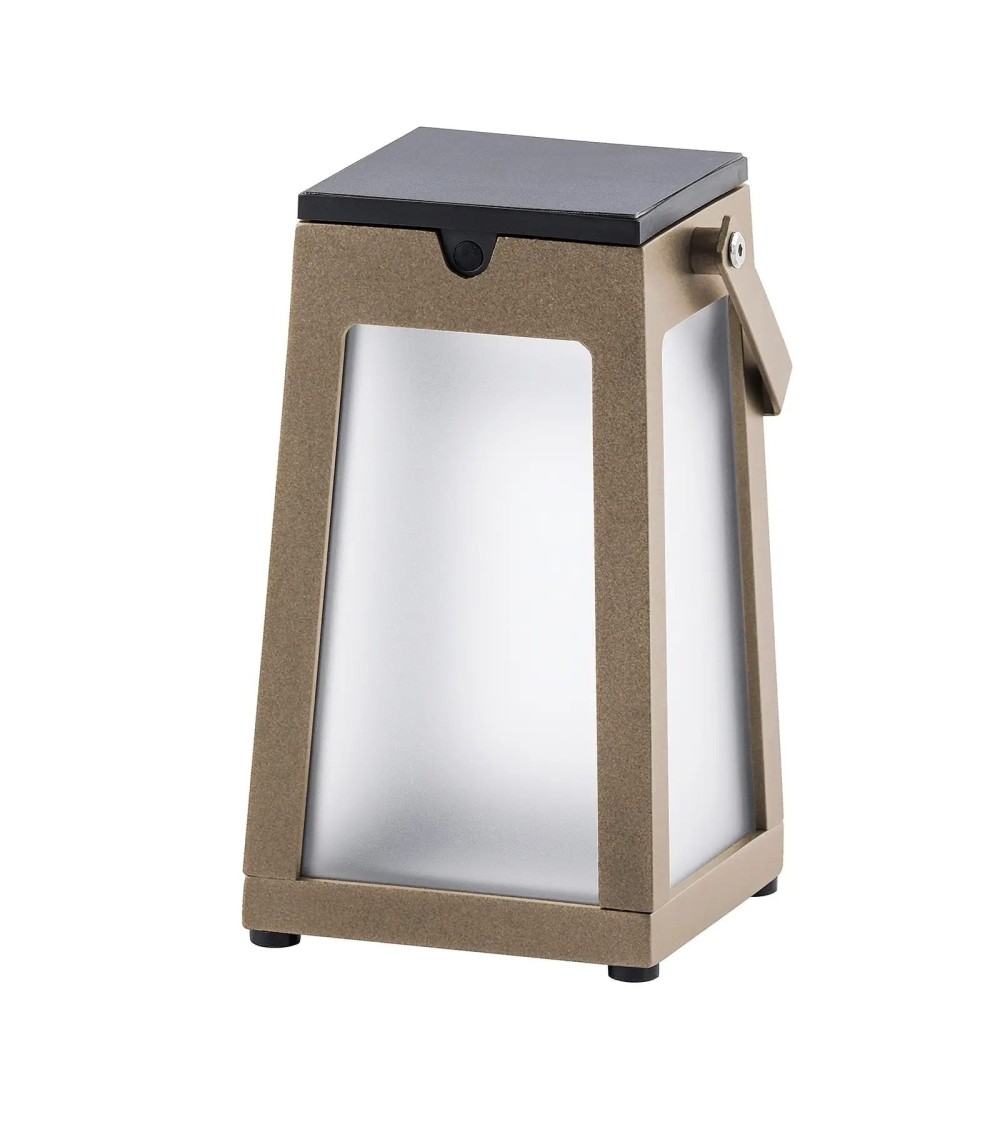 Plus simpliste mais tellement élégante, la lanterne solaire extérieur LED TINK beige est un véritable intemporel. Sa structure rectangulaire en aluminium n'enlève pas le charme de sa couleur muscade, dont les reflets s'accorderont parfaitement à tout type de décoration extérieur. Avec ses 25 cm de hauteur et son système complètement nomade, pas besoin d'installation, vous pourrez l'intégrer avec style dans tous les recoins de votre jardin ou de votre terrasse. Une fois chargée grâce à son fonctionnement solaire, elle assure une autonomie lumineuse de 4 à 150 heures, idéal pour vos longues soirées d'été entre amis ! Cette lanterne solaire dispose également d'un éclairage LED intégré et d'un step dimmer (0 à 100% sans palier) pour profiter d'une source lumineuse économe, conviviale (300 lumens) et ajustable en fonction de ses envies. Et si vous craignez de laisser votre lampe dehors, sachez qu'elle dispose d'un indice de protection IP55 qui la protège totalement contre les poussières et les fortes projections d'eau. Le petit plus ? Ce luminaire TINK est équipé d'un détecteur de mouvements pour vous assurer un éclairage sécurisant, ce même en pleine nuit. Les plus du produit : Nomade - Dimmable - Grande autonomie Caractéristiques : - Douille : Led int - Puissance : 2W - IP : 55 - Matière : metal