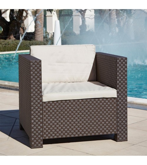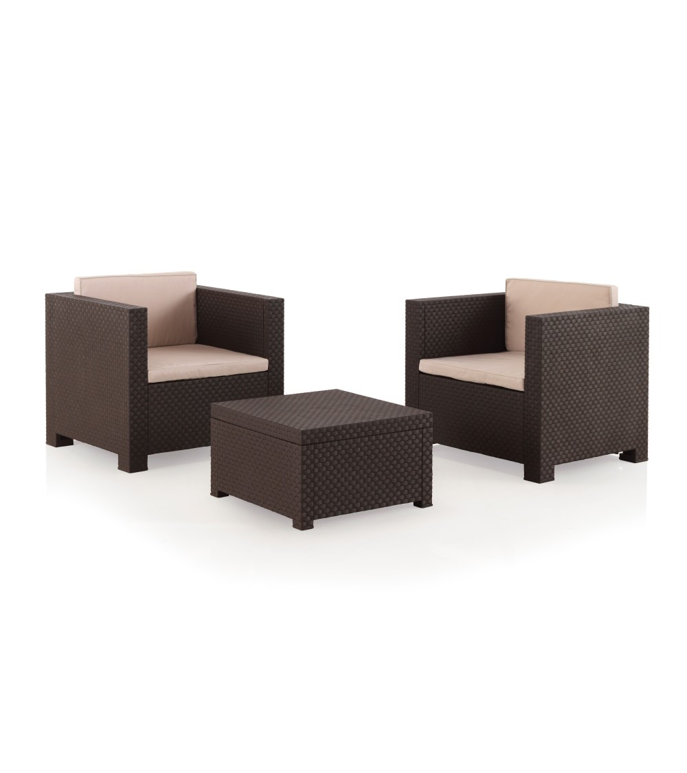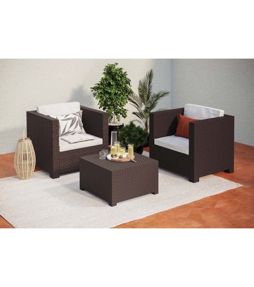 Diva TETE A TETESalon de Jardin 2 places en résine tressée recyclée. Composé de 2 fauteuils et une table basse-RESISTANT : Ensemble robuste, avec un filtre spécial qui le rend résistant aux UV et aux intempéries.-DESIGN ERGONOMIQUE : Grande largeur dassise, et dossier spécialement conçu pour sasseoir confortablement sans abimer votre dos.-CONFORT : Coussins faciles à nettoyer en polyester et poly Cotton pour plus de confort-DURABLE : Le mobilier SHAF est extrêmement durable et peut être utilisé toute lannée en toute confiance. Grace au filtre UV incorporé, le mobilier ne perd pas la couleur même lors dune utilisation longue durée en extérieur.-RECYCLE : Fabriqué 100% en Espagne avec PP recyclé. Produit 100% recyclable Composé de 2 fauteuils et une table basseFauteuil : 74 x 66 x 72cmTable : 57 x 57 x 34cm