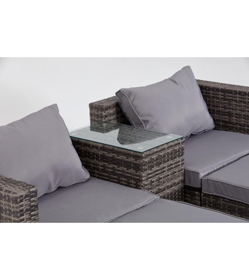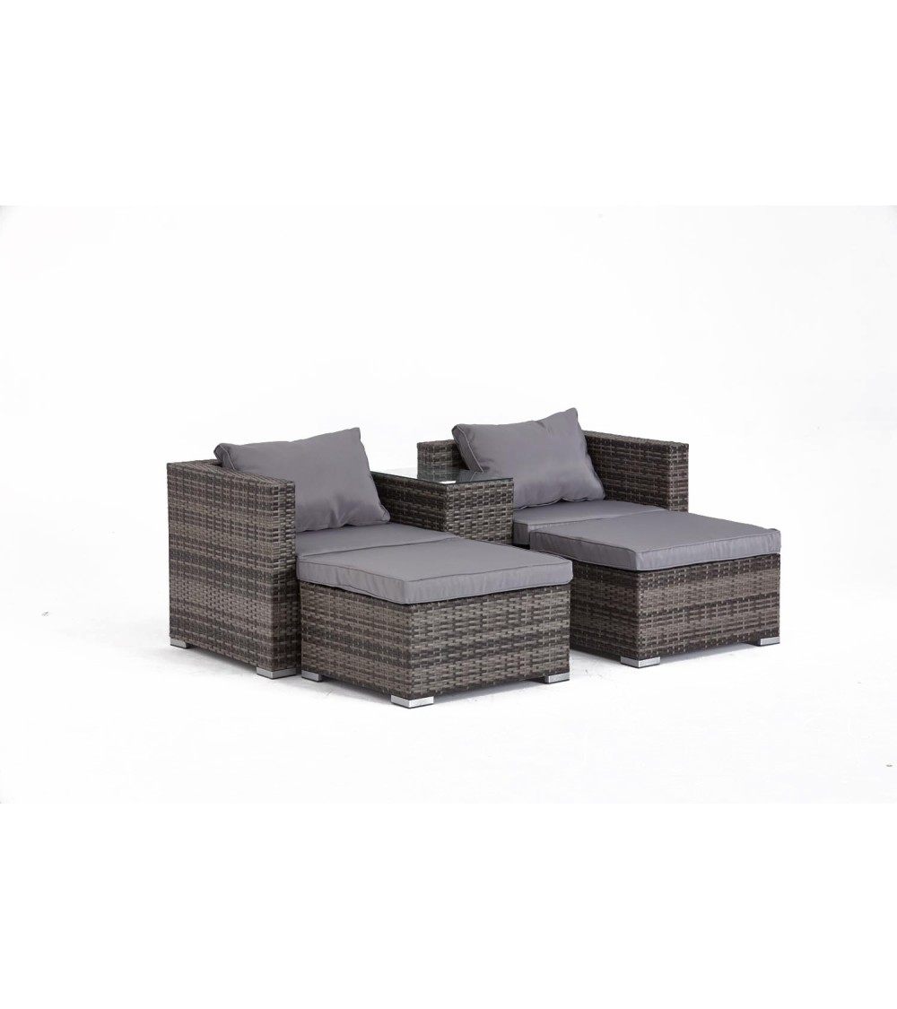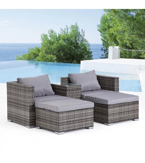 Salon de jardin 4 places noir & grisProfitez de votre jardin cet été avec ce salon en résine tressée. Pratique, il vous permet d'accueillir jusqu'à 4 personnes avec ses 2 fauteuils & ses 2 poufs ou bien d'allonger vos jambes en prenant le pouf comme repose-pieds ! Sa matière, la résine tressée, est la matière phare des salons de jardin grâce à sa résistance aux intempéries.Caractéristiques techniques :Nombre de modules : 5Détail des pièces : 1 table, 2 fauteuils, 2 poufsType de salon de jardin : DétenteCouleur principale : GrisCouleur secondaire : GrisForme de la table : RectangleMatière structure : AcierMatière table : Résine tresséeVerre sur la table : OuiType de verre : Verre trempé noirAvec coussin : OuiNombre de coussins : 6Couleur des coussins : GrisAssises déhoussables : OuiAvec zip : OuiDossiers déhoussables : NonModulable : OuiType de mousse des coussins : PolypropylèneDensité de la mousse : 1400gPoids maximum supporté par la table : 70 kgPoids maximum supporté par un fauteuil : 160 kgPoids maximum supporté par un fauteuil : 130 kgEntretien :Enlevez régulièrement la poussière avec un chiffon sec. Nettoyez et essuyez avec un chiffon humide. Protégez vos meubles en les recouvrant pendant les mois dhiver ou inutilisés pendant de longues périodes.Dimensions :Longueur totale : 144 cmLargeur totale : 170 cmHauteur totale : 65 cmDim