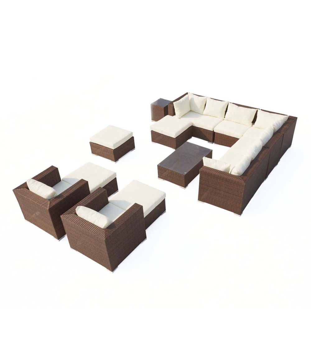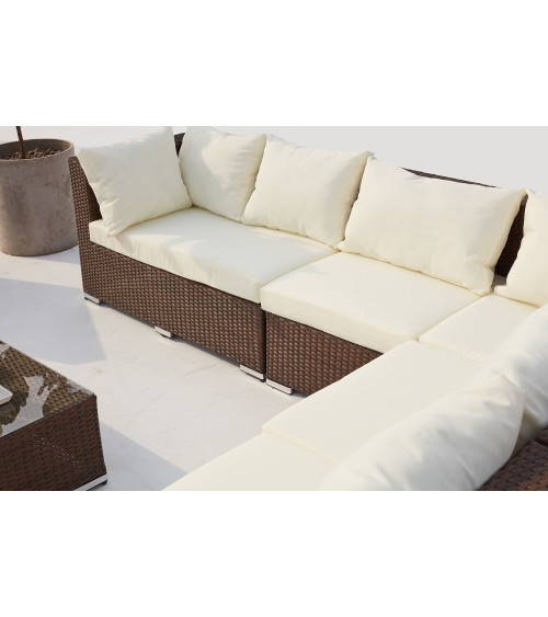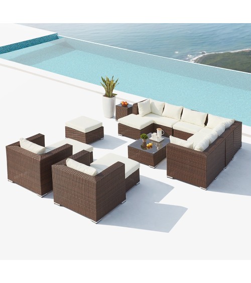 Le salon de jardin en résine tressée StallaC'est un salon qui possède la capacité daccueil la plus importante que nous proposons actuellement, vous pouvez ainsi accueillir sans aucun problème 13 à 14 personnes. Composé de résine tressée 4 fils, tressée à la main et ressemblant au rotin naturel, le salon de jardin Stalla est aussi design que robuste. Sa structure en aluminium recouvert de peinture epoxy lui octroi légèreté et solidité mais également une très bonne résistance face aux conditions naturelles (UV / neige / pluie / eaux salées) et permet une conservation des qualités esthétiques et structurelles.Muni dune assise ferme et confortable, les fauteuils et méridiennes de ce salon de jardin en résine tressée sont entièrement modulables, au même titre que la table basse et la table dappoint bi-matière (verre sécurit et résine tressée). Les coussins sont moelleux, imperméable, déhoussables et lavables. Lentretient du salon de jardin Stalla est très simple et ne nécessite quun simplet jet deau pour le nettoyage. Caractéristiques Techniques : Type de table : Carré/RectangleNombre de places : 13Couleur principale : MarronCouleur des coussins : BlancMatière : Résine tresséeType de matière : Poly rotin 4 filsStructure : AluminiumNombre de modules : 13Type de verre : Verre trempé clairMatière des coussins : 100% PolyesterGarnissage des coussins : 90 % Polyuréthane + 10% PolypropylèneDimensions :Epaisseur du verre