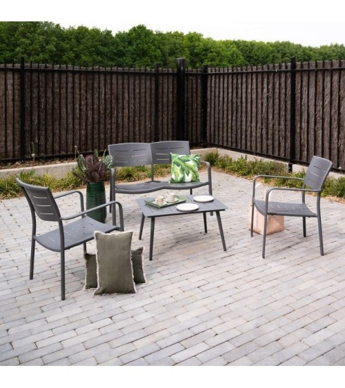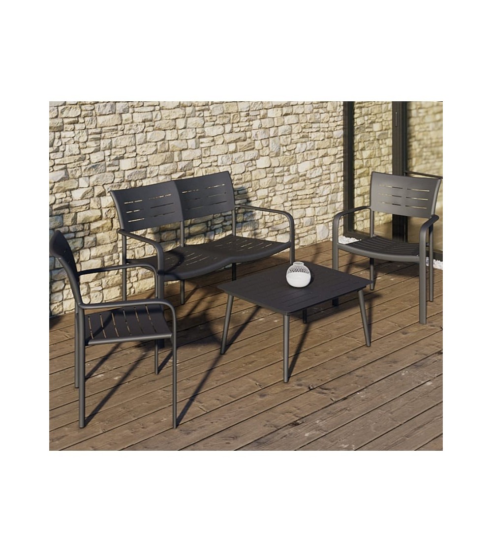 Salon de jardin détente en aluminium. Composé de 2 fauteuils bas, 1 canapé et 1 table basse. Dimensions : fauteuils bas : L62 X l 68 X H 86 cm, canapé : L 124 X l 68 X H 86 cm, table basse : L 80 X l 60 X H 40 cm. Rangement facile, fauteuils empilables sur le canapé. Disponible en 2 couleurs : carbone et sable.