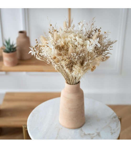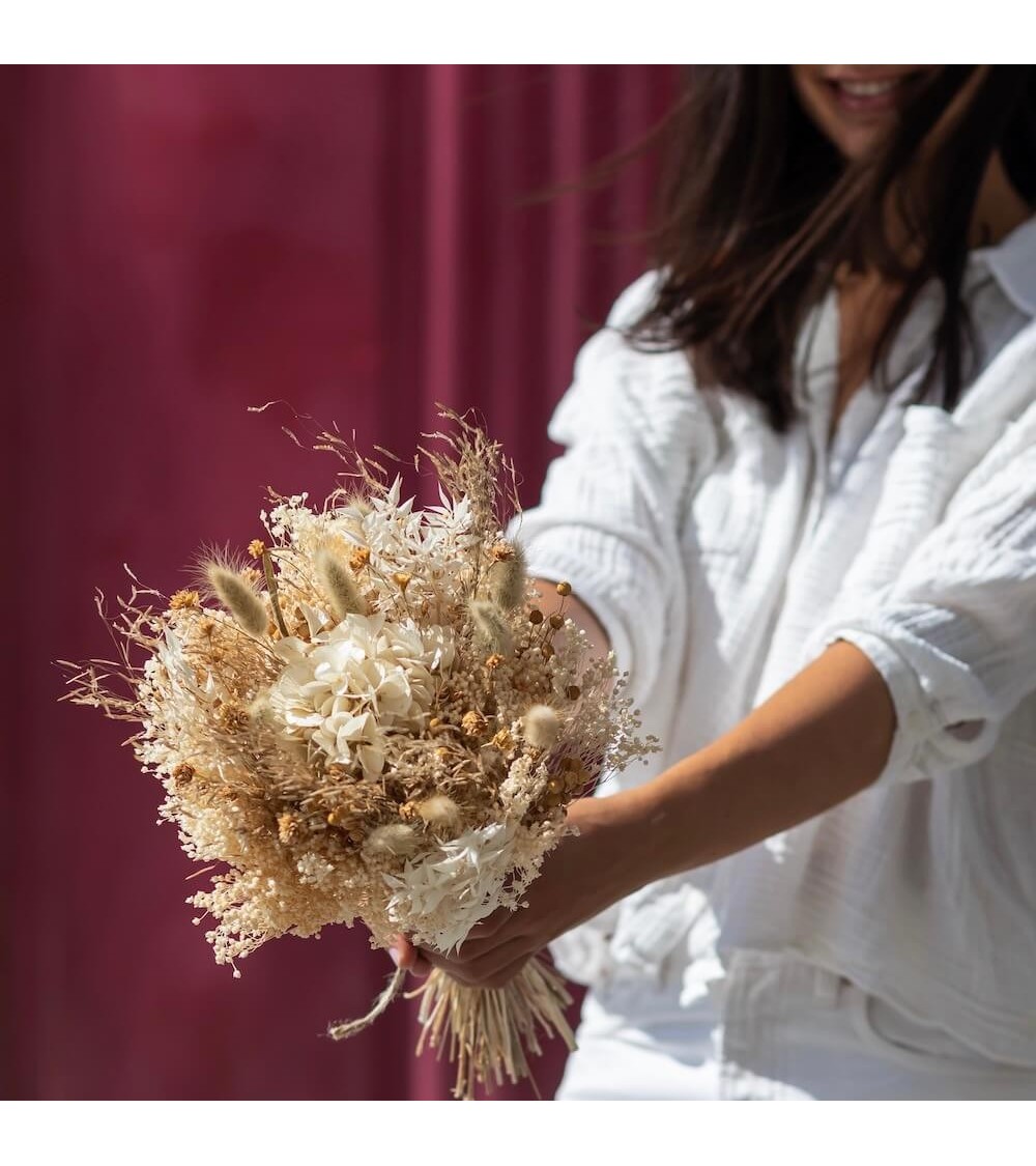 On craque pour ce bouquet ! Pendant la fête des mères, c'est un de vos cadeaux favoris et votre maman va adorer :) Le bouquet Côme est une véritable symphonie de teintes naturelles, un assemblage soigneusement choisi de fleurs séchées qui, ensemble, créent une palette de couleurs harmonieuse et apaisante. Ce bouquet est bien plus qu'une simple composition florale, il est l'expression d'une douceur et d'une pureté qui se dégagent à travers chaque fleur, chaque feuille, chaque tige. Chaque élément de ce bouquet contribue à une atmosphère de sérénité, de paix et de tranquillité. Le bouquet Côme est une véritable fusion entre l'art et la nature. Avec sa palette de teintes douces et naturelles, il s'insère avec fluidité dans tous les styles de décoration, qu'ils soient modernes, classiques, rustiques ou bohèmes. Les lagurus duveteux apportent une texture douce et soyeuse, tandis que l'hortensia préservé offre une touche de sophistication et d'élégance. Ce bouquet, c'est une invitation à la détente, une incitation à s'installer confortablement et à savourer une après-midi de détente. Que ce soit dans un salon cosy, une chambre apaisante ou un bureau inspirant, le bouquet Côme apporte une touche de douceur et d'harmonie. Idéal pour un mariage à la fois sobre et romantique, le bouquet Côme se présente comme un choix parfait pour un bouquet de mariée. Son allure naturelle et élégante s'accorde parfaitement à une cérémonie empreinte de douceur et de romantisme. Il incarne la promesse d'un amour pur, une déclaration d'affection subtile et intemporelle. Une autre envie, découvrez nos autres bouquets de fleurs séchées ou retrouvez l'ensemble de nos créations en fleurs séchées.