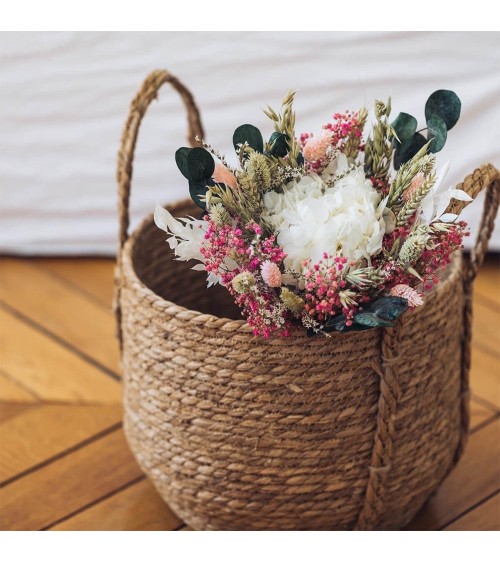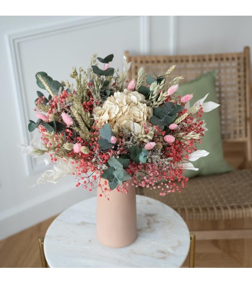 Une très belle idée de cadeau pour la fête des mères. En tout cas, c'est votre bouquet préféré ! Rencontrez Hector, notre bouquet signature, un véritable chef-d'?uvre floral qui incarne l'essence même de Flowrette. Ce bouquet est une composition harmonieuse de fleurs séchées et stabilisées, créant un spectacle visuel de textures et de couleurs. Hector se distingue par son hortensia central, qui apporte une touche d'élégance et de modernité. L'eucalyptus, avec ses feuilles persistantes, ajoute une note de fraîcheur et de vitalité. Les phalaris rose et le gypsophile rose apportent des nuances de rose, créant une atmosphère douce et romantique. La statice, le ruscus, l'avoine et le blé complètent le bouquet, ajoutant de la texture et du volume. Ce bouquet a été imaginé et créé par Élodie, co-fondatrice de Flowrette, qui incarne l'image de la marque. Elle a un talent inné pour l'harmonie des couleurs, composant des bouquets aussi doux que délicats. Hector est plus qu'un simple bouquet, c'est une pièce d'art floral, un symbole de l'amour et de l'appréciation. Il est parfait pour ajouter une touche de couleur et de nature à votre intérieur, ou pour offrir en cadeau à quelqu'un de spécial. Une autre envie, découvrez nos autres bouquets de fleurs séchées ou retrouvez l'ensemble de nos créations en fleurs séchées.