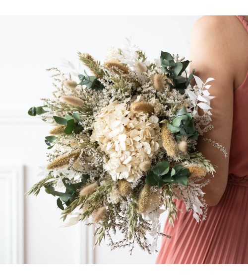 Anatole is an elegant and rustic bouquet of preserved flowers, featuring eucalyptus, preserved hydrangea, natural oats, and soft lagurus. Flowrette offers a variety of dried flower arrangements.