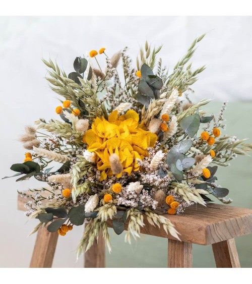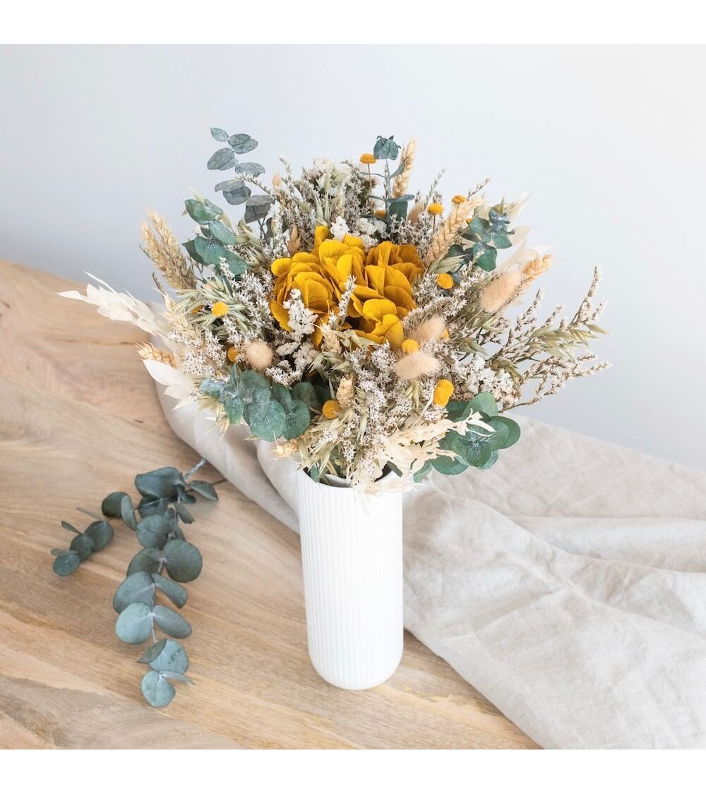Une belle idée de cadeau pour votre maman. C'est un de vos bouquets préférés ! Le bouquet Ambroise se présente comme une édition réinventée de notre populaire bouquet Hector, incorporant des teintes vibrantes de jaune safran. Ce bouquet délicat et élégant promet d'apporter une explosion de couleur et une touche de sophistication bohème à votre espace. En ce qui concerne sa composition, le bouquet Ambroise se distingue par une harmonie de fleurs et de plantes variées. Il comprend de la statice blanc, de l'hortensia jaune, de l'eucalyptus, du ruscus, du mini statice, de l'avoine, du lagurus, du blé et du botao, créant ainsi un mélange riche et texturé qui captivera les regards. Une autre envie, découvrez nos autres bouquets de fleurs séchées ou retrouvez l'ensemble de nos créations en fleurs séchées.