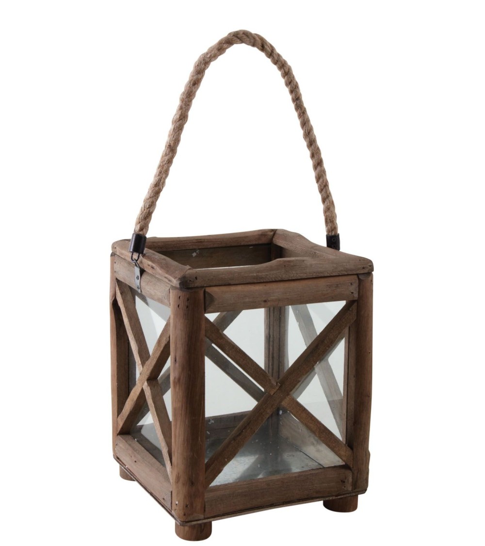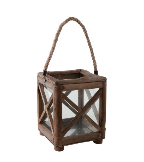 Aspect : Matériau principal : BoisMatériaux secondaires : VerreDimensions : Hauteur (en cm) : 29,00Longueur (en cm) : 24,00Profondeur (en cm) : 24,00Autres caractéristiques : Poids (en kg) : 3,17 Lanterne de jardin carrée en bois et verre avec anse en corde.