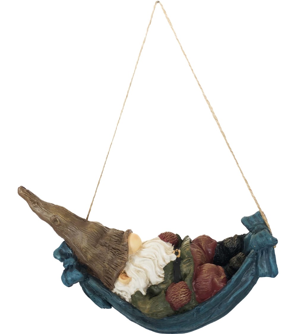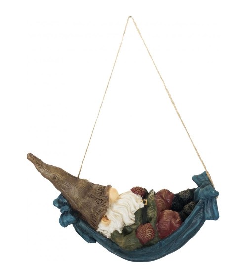 Aspect : Matériau principal : RésineMatériaux secondaires : CordeDimensions : Hauteur (en cm) : 13Longueur (en cm) : 9,40Profondeur (en cm) : 21,60Autres caractéristiques : Poids (en kg) : 0,37 Nain de jardin dans hamac en résine à suspendre