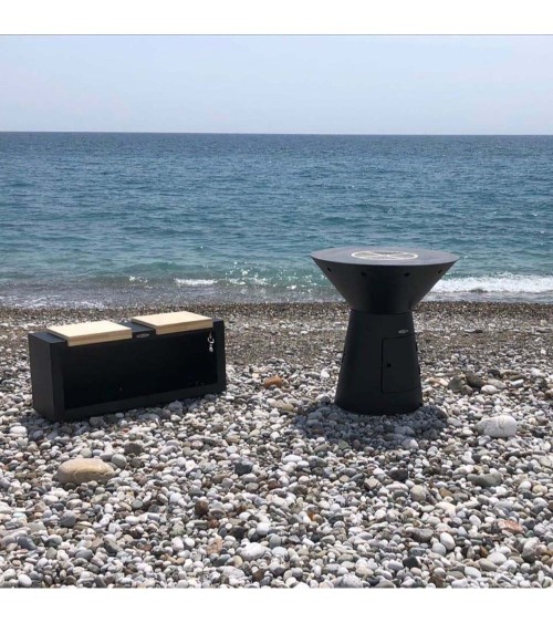 Aspect : Finitions : Thermolaqué noirMatériau principal : Acier (corps)Matériaux secondaires : Acier inoxydable (zone de chauffe - socle - table de cuisson)Autres dimensions : Grille : 45 cmSurface de cuisson : 99 cmDimensions : Hauteur (en cm) : 99Longueur (en cm) : 99Profondeur (en cm) : 101Autres caractéristiques : Composition : Socle - Table de cuisson - Ventilation - Récupérateur de cendres et trappe de visite - Livré avec 2 tablettes en granitInformations complémentaires : 2 en 1 barbecue et brasero , Cuisson avec du bois de chauffage ou du charbon de boisPoids (en kg) : 85Taille brasero : Taille L Corps acier finition thermolaquée noireZone de chauffe en inox + tablettesAvec ventilation, récupérateur de cendre et trappeFabrication artisanale AllemandeHauteur 99 cm , Diamètre 99 cm
