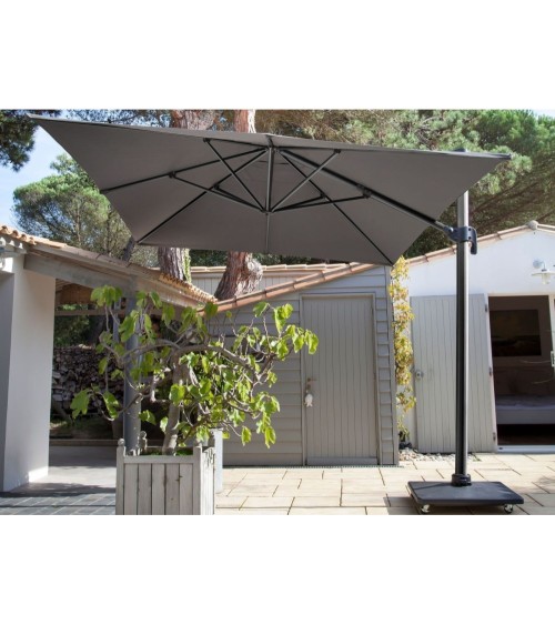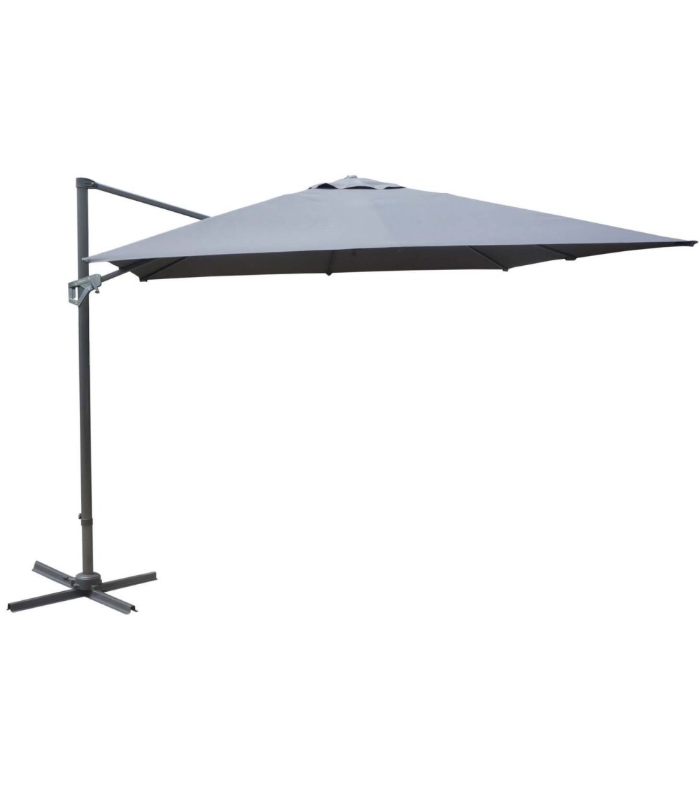 Aspect : Coloris : GrisMatériau principal : Toile polyester 250 grMatériaux secondaires : Aluminium (mât)Dimensions : Longueur (en cm) : 400Profondeur (en cm) : 300,00Autres caractéristiques : Informations complémentaires : Inclinable Mât de 53x77 mm Platine tournante 360° Ouverture avec manivelle Pieds en croix à lester (dalles non fournies) Poids (en kg) : 27,00 Toile polyester 210 gr/m², déperlantMât aluminium 53/77 mm + 8 baleinesOuverture facile par manivelle + inclinable et pivotantPied en croix à lester (dalles non fournies)Longueur 4 m , Largeur 3 m , Hauteur 2,8 m