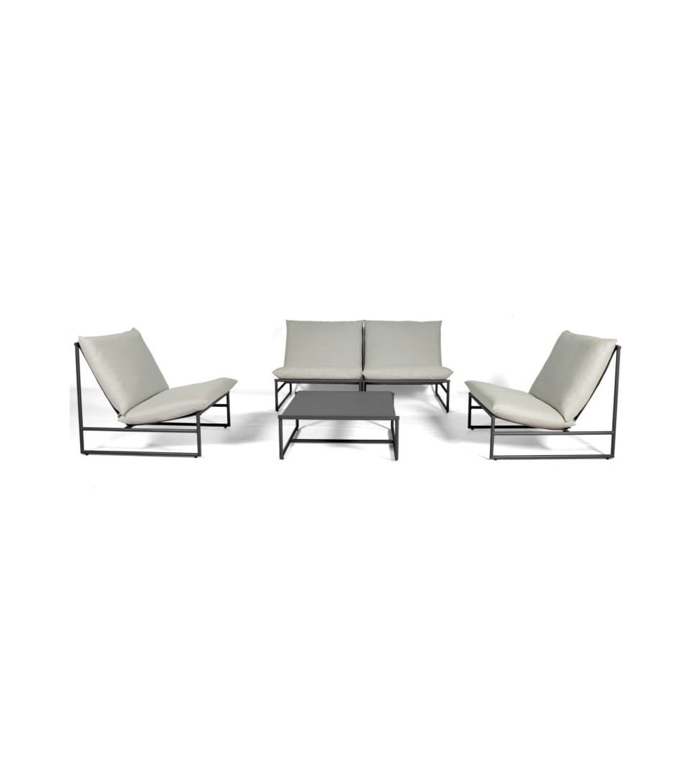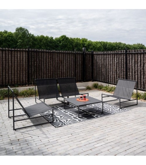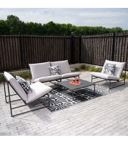 Salon de jardin bas en aluminium et textilène composé de 4 fauteuils et 1 table basse. Dimensions : table basse : L85 x l88 x H33,2 cm, fauteuil : L85 x l91 x H92 cm. Matières : aluminium, textilène, oléfine, coussin 20kg/m³. Utilisable avec et sans coussins.