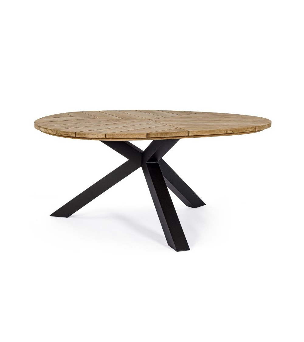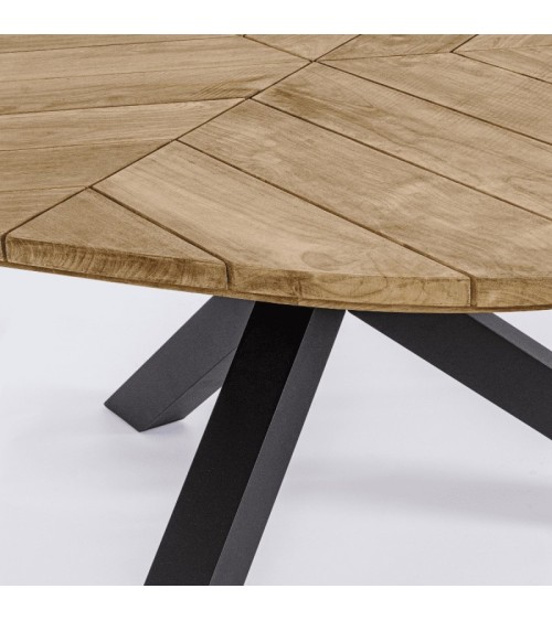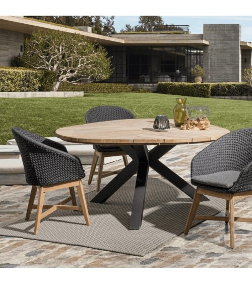 Table de jardin design bois de teck ronde diamètre 160 cm. Plateau en bois de teck classe A. Pieds en aluminium. Dimensions : diamètre 160 x H77 cm. Quincaillerie en acier galvanisé. Nombre de places : jusquà 8. Teck svlk bois certifié provenant de forêts gérées durablement. Disponible avec pieds noir et pieds blancs. A monter soi-même.