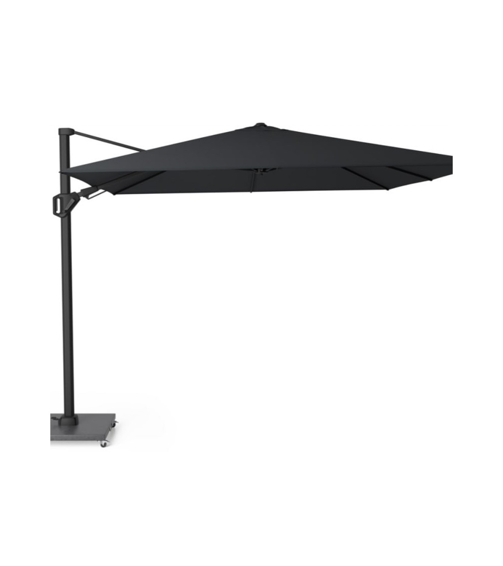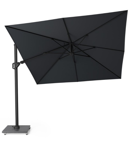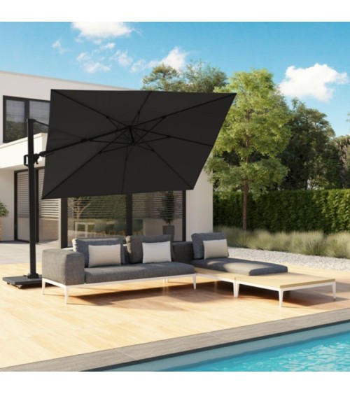Parasol carré déporté de 3x3 m. Double inclinaison, rotatif à 360 degrés. Toile déperlante en Spuncrylic et dense de 240g/m², hydrofuge et antisalissures, UPF 50. Ouverture facile par manivelle. Cheminée d'aération. Armature du parasol en aluminium noir : 5,3 x 8,6 x 0,2 x 250 cm. 8 baleines en aluminium. Hauteur : fermé 2m52, ouvert 2m55 (sans pied). Important : pied et housse vendus séparément. Nous conseillons un pied de 90 kilos minimum. 120 kilos en cas d'exposition au vent. Pour protéger et préserver votre parasol nous vous conseillons les housses de protection Aerocover vendues à part.