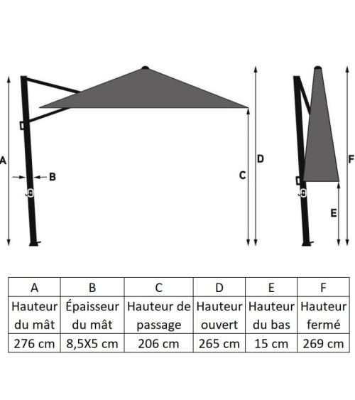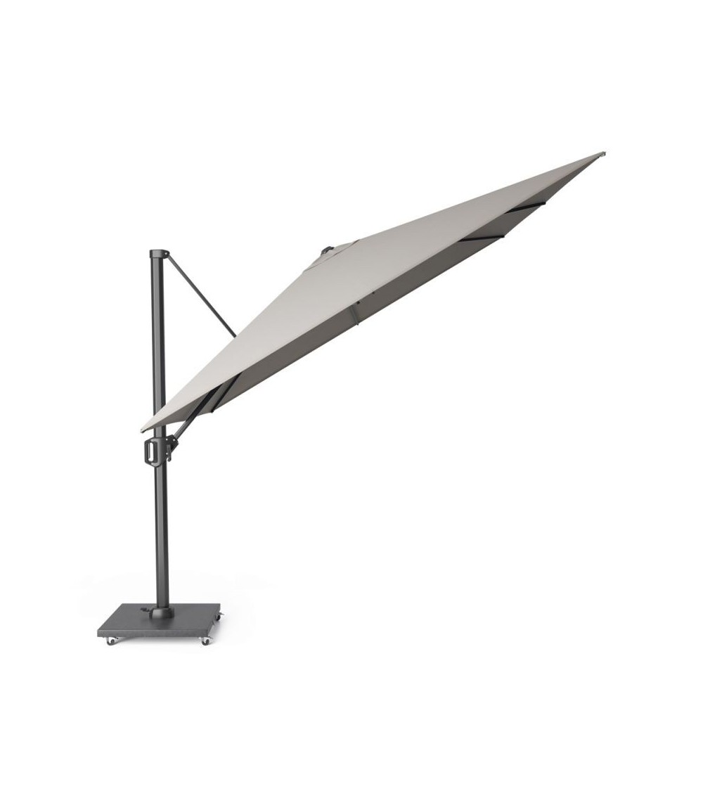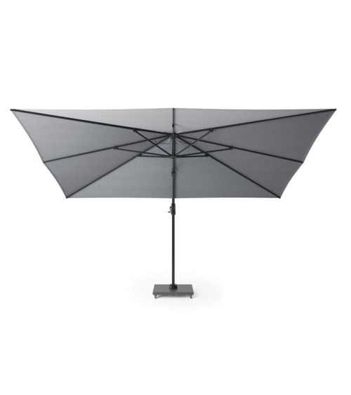 Parasol rectangulaire déporté 4x3 m Challenger T1 Platinum. Simple inclinaison, rotatif à 360 degrés grâce à sa pédale. Toile déperlante en Spuncrylic de 240g/m², hydrofuge et antisalissures, UPF 50 plus. Disponible en plusieurs couleurs de toile. Ouverture facile par manivelle. Cheminée d'aération. Structure du parasol en aluminium : 5,3 x 8,6 x 0,2 x 250 cm. 8 baleines en aluminium. Hauteur : fermé 2m70, ouvert 2m57 (sans pied). Important : pied et housse vendus séparément. Nous conseillons un pied de 150 kilos minimum. Pour protéger et préserver votre parasol nous vous conseillons les housses de protection Aerocover vendues à part.