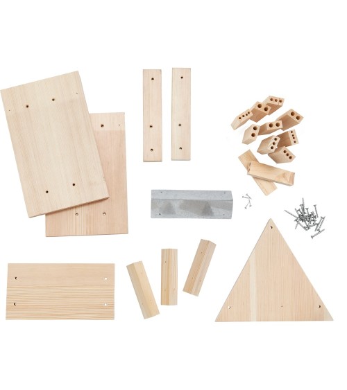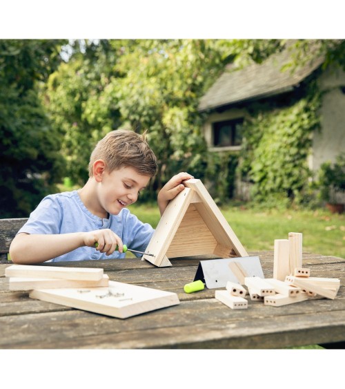 Ici les insectes utiles trouveront un gîte accueillant pour déposer leurs oeufs. Le gros uvre de lhôtel est terminé en un clin dil, car seules les pièces en bois doivent être vissées entre elles. Une tôle protège le pignon de lhumidité. Des morceaux de bois pré-percés sont fournis pour accessoiriser lintérieur, et les enfants pourront chercher eux-mêmes dans la nature les autres matériaux de remplissage (brindilles, paille, terre glaise, coquilles d'escargot...).Contenu : kit de 20 pièces en bois et métal (vis incluses), 1 notice explicative.Matières : bois et métal.Dimensions après assemblage : l 28,5 x h 40 x p 28,5 cm.Kit d'assemblage Hôtel pour insectes de la gamme Terra Kids de chez Haba. Référence 304543.