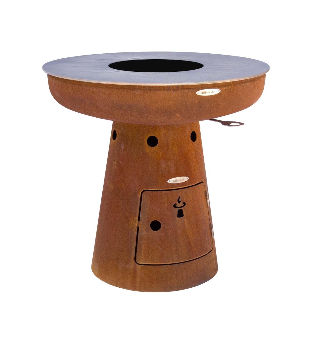 Aspect : Matériau principal : Acier (corps)Matériaux secondaires : Acier inoxydable (zone de chauffe)Dimensions : Diamètre (en cm) : 82Diamètre de la grille (en cm) : 34Hauteur (en cm) : 79Autres caractéristiques : Composition : Socle - Table de cuisson - Ventilation - Récupérateur de cendres et trappeInformations complémentaires : 2 en 1 barbecue et brasero Cuisson avec du bois de chauffage ou du charbon de bois Poids (en kg) : 61Taille brasero : Taille M Corps acier corten ultra résistantZone de chauffe en inoxAvec ventilation et récupérateur de cendreFabrication artisanale AllemandeHauteur 79 cm , Diamètre 82 cm