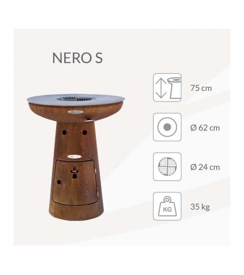 Aspect : Matériau principal : Acier corten (corps)Matériaux secondaires : Acier inoxydable (zone de chauffe)Dimensions : Diamètre (en cm) : 62Diamètre de la grille (en cm) : 24Hauteur (en cm) : 75Autres caractéristiques : Composition : Socle - Table de cuisson - Ventilation - Récupérateur de cendres et trappeInformations complémentaires : 2 en 1 barbecue et brasero Cuisson avec du bois de chauffage ou du charbon de bois Poids (en kg) : 35Taille brasero : Taille S Corps acier corten ultra résistantZone de chauffe en inoxAvec ventilation et récupérateur de cendreFabrication artisanale AllemandeHauteur 75 cm , Diamètre 62 cm