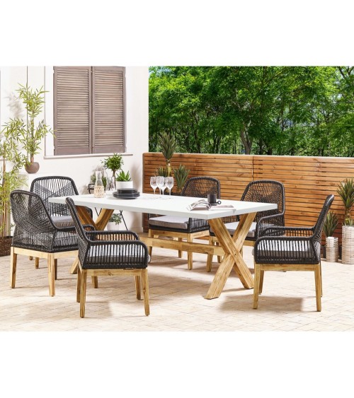 Rehaussez le look de votre jardin avec cette table à manger unique en son genre. Son plateau rectangulaire en fibre-ciment est parfaitement adapté aux espaces extérieurs à usage intense, car tout en étant facile à nettoyer il est très résistant à diverses conditions météorologiques. Le design minimaliste de ce plateau de table est complété par des pieds en bois d'acacia massif d'un teint clair et chaleureux - un mariage de matières et de styles à la fois original et très tendance. Avec son allure épurée et scandinave, cette table de jardin s'intégrera sûrement dans chaque espace urbain et moderne. Cette table de repas de jardin a été conçue pour accueillir confortablement jusqu'à 8 personnes.