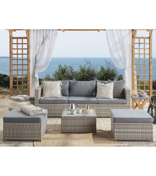 Ce superbe salon bas de jardin marie le style à la praticité ! Il se compose dun canapé 3 places capable de se transformer en un lit de jour, grâce aux assises relevables et réglables ainsi que de 2 poufs ottomans et dune table basse parfaitement assortie. Ce salon de jardin sajuste à tous les besoins en vous offrant de nombreuses configurations : il suffit de placer les poufs contre le canapé pour obtenir un canapé dangle ou encore un canapé panoramique. Lensemble est fabriqué à partir de polyrotin (résine tressée) résistant aux intempéries et daluminium robuste. Un choix idéal pour les espaces extérieurs modernes et scandinaves.
