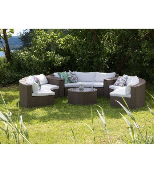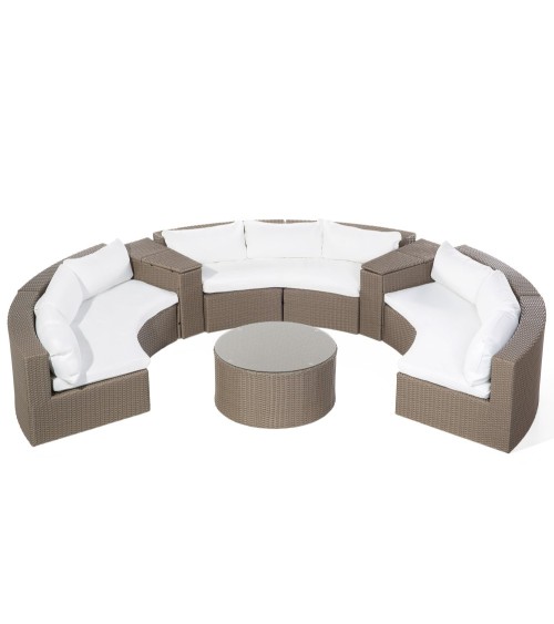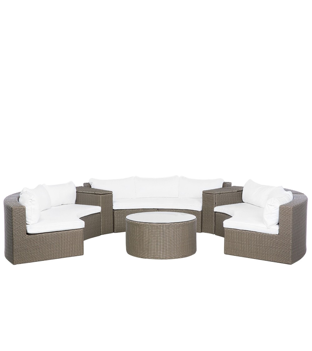 Salon de jardin en polyrotin pour 9 personnes. Le beau temps et le confort seront présents cet été ! Offrez-vous un salon de jardin spacieux en polyrotin afin d'accueillir tous vos invités. Avec ce merveilleux set pour l'extérieur, vous pouvez ainsi créer un espace confortable en forme de demi-cercle pour neuf personnes. Non seulement, l'ensemble pour terrasse et/ou jardin présente une capacité d'accueil importante, il a aussi un aspect intemporel, élégant et vous donne un maximum de confort. L'ensemble comprend six éléments de sièges arrondis, équipés de coussins de siège et de coussins de dossier doux. Les revêtements des coussins sont déhoussables et lavables en machine avec un programme de 40°, ils sont en tissu polyester, très résistant contre la saleté et les intempéries. L'ensemble comprend également, deux coins rangements à intercaler entre les différents éléments de sièges, comme séparateur. En plus des espaces de stockage pour les oreillers et autres ustensiles, une petite table basse est comprise dans l'offre, de forme ronde et équipée d'un plateau en verre, afin de poser vos cocktails bien frais. Les meubles de jardin en poly rotin sont respectueux de l'environnement. En plus, ils sont très durables et résistants aux UV. Ce matériau est facile à entretenir et exceptionnellement résistant aux différentes conditions météorologiques (de -20 ° C à + 50 ° C), ce qui le rend idéal pour un stockage extérieur à long terme. Un salon de jardin spacieux, confortable, élégant et de haute qualité. De quoi vous rendre de bonne humeur cet été ! Détails: Type de produit: Set de salon Style: Moderne Couleur principale: Marron Nuance: Blanc cassé Type de matière: Rotin Matière principale: Polyrotin Matière secondaire: Verre de sécurité Composition de la matière: 100% Polyester Forme: Rond Finition: Revêtu de poudre