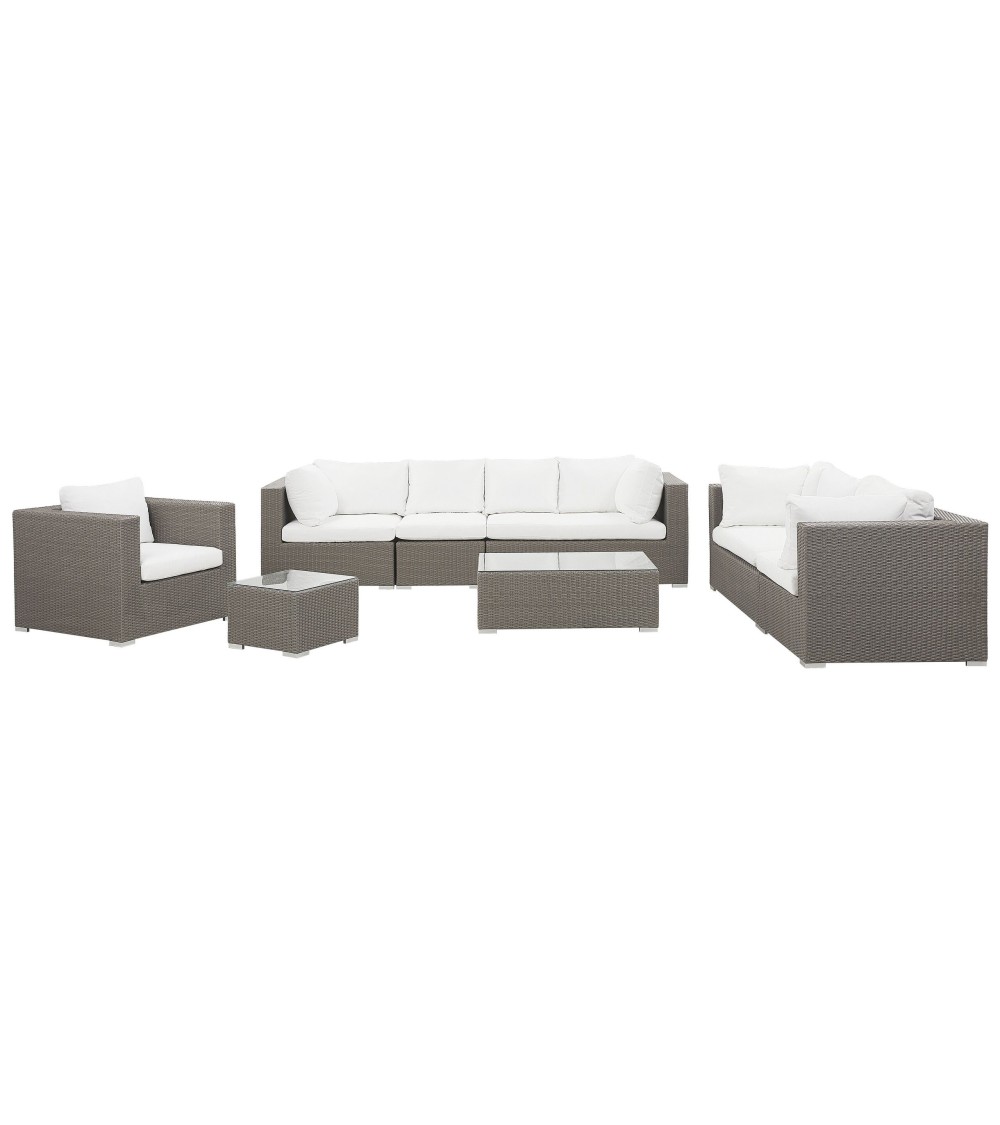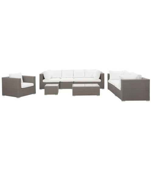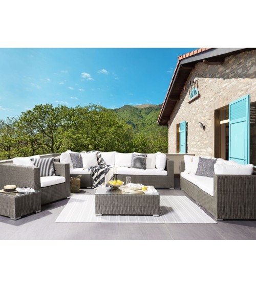 Ce beau salon de jardin complet, au design élégant et moderne, apportera à votre extérieur beaucoup de charme et de confort. Les deux canapés, faisant partie de cet ensemble d'extérieur, se composent de pièces modulables qui permettent une multitude de configurations. Vous pouvez donc réagencer ce salon de jardin conformément à vos besoins et attentes. Un fauteuil confortable et 2 tables basses assorties font aussi partie de cet ensemble intemporel. Fait en aluminium et rotin PE (polyrotin) gris-beige - matières durables et résistantes - ce set de meubles de jardin au design contemporain a été conçu pour vous réjouir de longues années. Pour encore plus de confort, il vous est proposé avec ses coussins blancs moelleux à housses amovibles, facilement lavables en machine. Plus besoin de faire des compromis entre style et fonctionnalité !