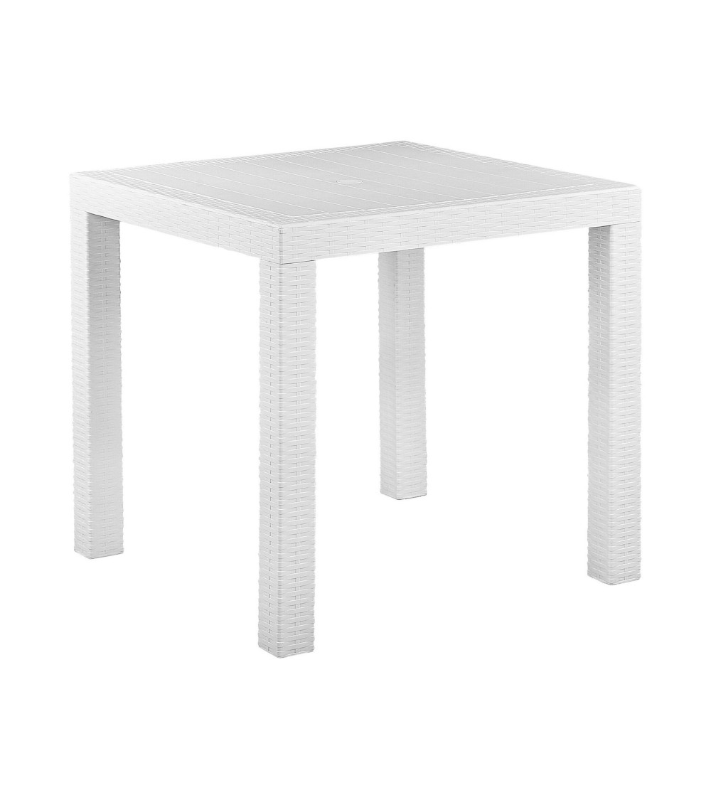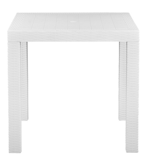 Profitez des après-midi d'été à l'extérieur en partageant un délicieux repas avec vos amis et votre famille. Fabriquée dans un matériau synthétique extrêmement facile à entretenir, cette belle table de jardin carrée résiste aux rayons UV et à l'humidité. On apprécie son look effet rotin blanc et le fait qu'elle peut accueillr confortablement jusqu'à 4 personnes. Cette table à manger sera parfaite sur une terrasse moderne, décorée de plantes vertes et de bougies parfumées.