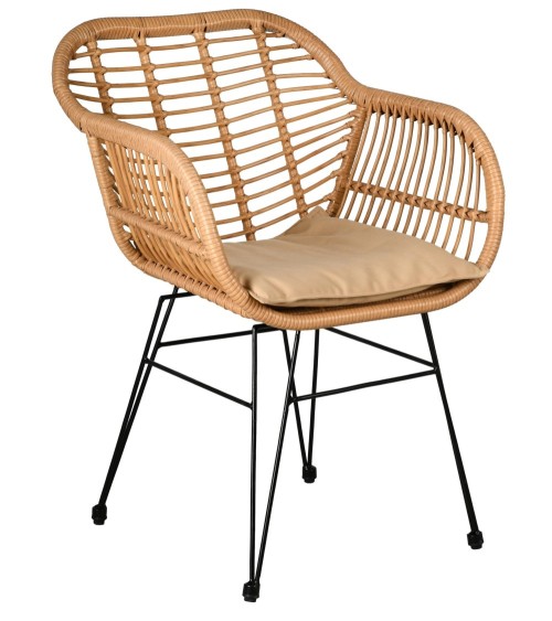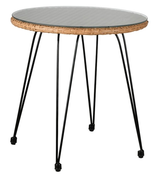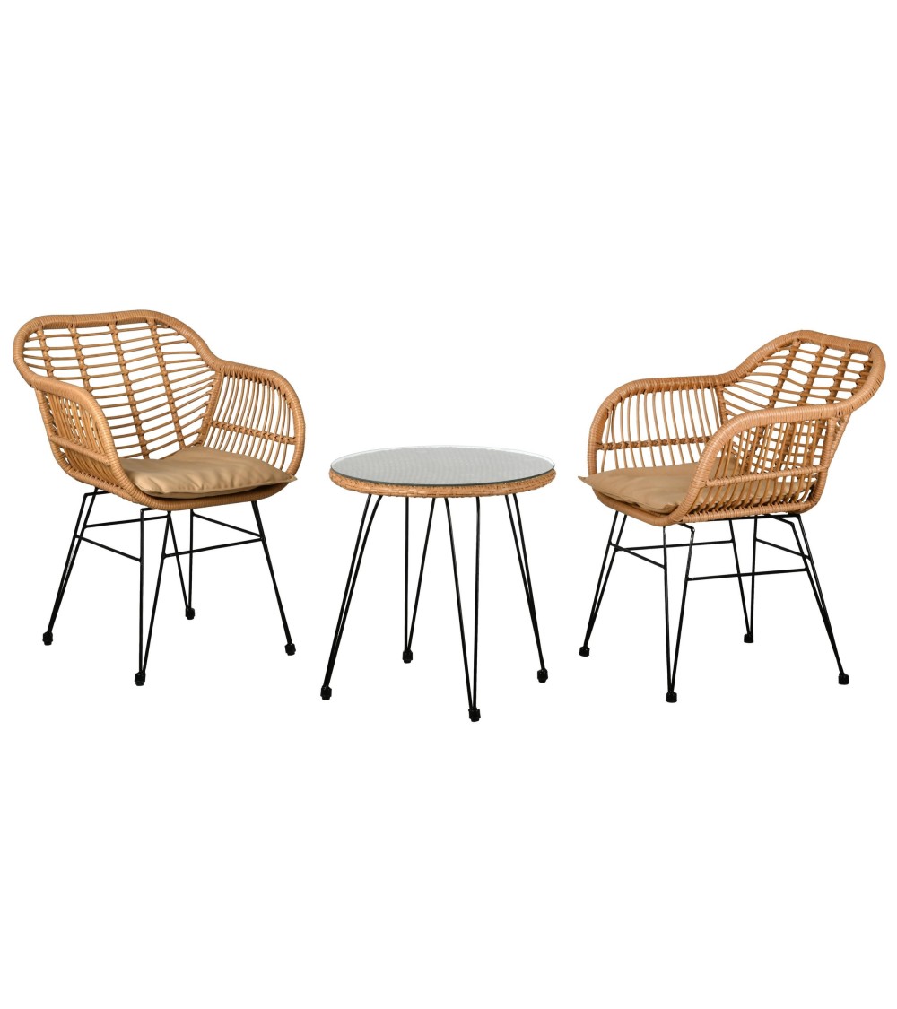 Aspect : Coloris : Naturel et noir (métal)Finitions : Tissu imperméabiliséMatériau principal : PolyrésineMatériaux secondaires : Métal Verre Flocons de mousse polyéther (garniture coussins) Tissu 100% polyester Autres dimensions : Dimensions fauteuil (en cm) : 56 x 60 x 80 (L x P x H)Dimensions table basse (en cm) : 52 x 54 (D x H)Épaisseur plateau verre (en cm) : 0,50Autres caractéristiques : Composition : 2 fauteuils + 1 table basse plateau verre trempé + 2 coussins d'assiseLivré en kit : OuiPoids (en kg) : 21 Salon 3 pièces en rotin synthétique Eden