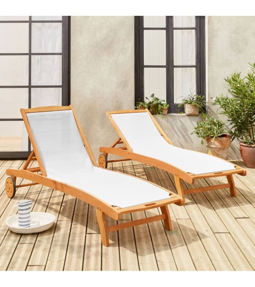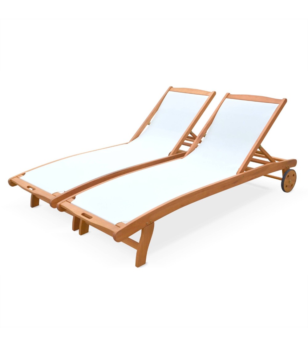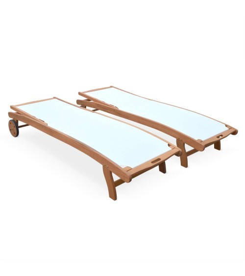 Ensemble de 2 transats en bois d'eucalyptus huilé et textilène blanc