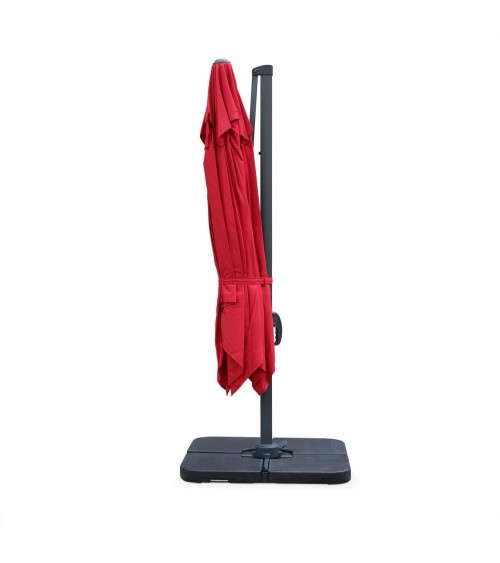 Les + produits Housse offerteToile déperlante et très dense de 240g/m²Inclinable rabattable et rotatif à 360°Structure robuste en aluminium Ce parasol déporté haut de gamme Falgos, de forme carrée (3 x 3 m), est l'accessoire indispensable de votre jardin ou votre terrasse, pour parer efficacement au soleil ou aux petites averses.Il se manipule facilement grâce à sa manivelle anti-retour, sa poignée d'inclinaison et sa pédale de rotation.De plus, ce parasol de jardin est inclinable et rabattable à la verticale une fois ouvert.Tous les parasols de notre collection possèdent un auvent sur le sommet, ce qui permet à l'air de circuler, et, en cas de légère brise, de ne pas prendre le vent.La structure de nos parasols est entièrement fabriquée en aluminium, du mat jusqu'aux baleines, afin de vous promettre une durabilité dans le temps, et une résistance maximale aux conditions extérieures.La toile en polyester a été sélectionnée pour son importante densité de 240g / m², garantissant une opacité importante et un ombrage efficace, filtrant les rayons du soleil. Le tissu est enduit d'un produit hydrofuge, rendant la toile déperlante au contact de l'eau.Son pied en forme de croix (fourni), pourra être fixé dans un sol dur, ou être lesté avec des dalles dédiées.Une housse de protection est inclusePoids : 21kgAttention, les dalles nécessaires pour lester le parasol ne sont pas fournies, vous retrouverez une sélection de dalles dans notre boutique (remplissable ou en résine).Vous pourrez trouver également des lests spéciaux en béton (de 40x40cm à 50x50cm), dans les grandes surfaces de bricolage.
