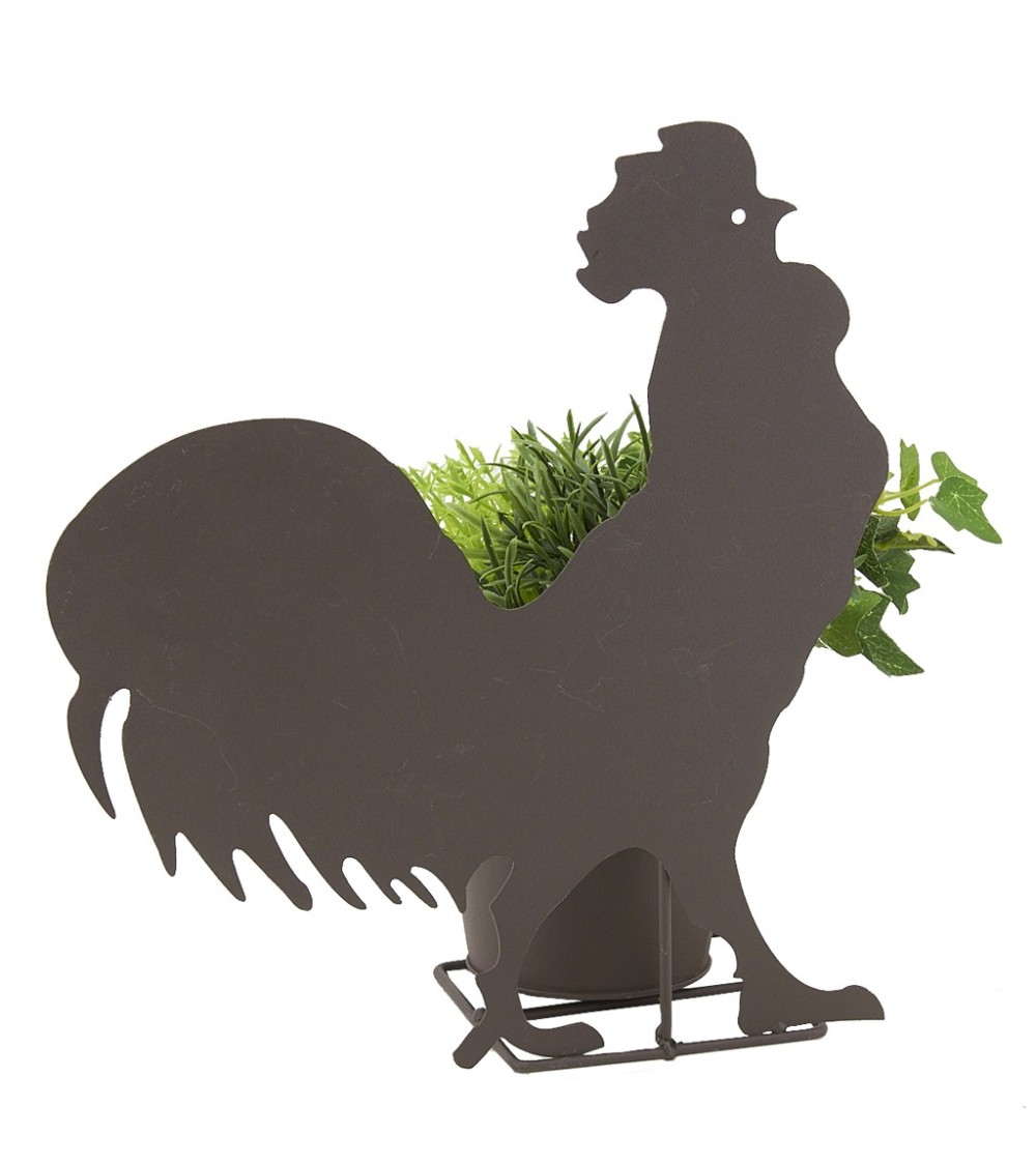 Aspect : Matériau principal : Métal rouilléDimensions : Hauteur (en cm) : 31Longueur (en cm) : 25,00Profondeur (en cm) : 12,00Dimensions du pot : Diamètre (en cm) : 11,00Hauteur (en cm) : 11,00Autres caractéristiques : Poids (en kg) : 0,44 Cache-pot en forme de coqEn métal rouille, résiste aux intempériesStructure en métal pour une bonne stabilité du coqueCache-pot en zinc (Diamètre 11 cm , Hauteur 11 cm) Longueur 25 cm , Largeur 12 cm , Hauteur 31 cm
