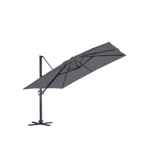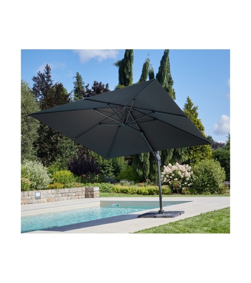 Cet élégant parasol de 4x3 m est constitué d'aluminium de couleur anthracite et se monte facilement et seul.Composé de 8 baleines et d'un poteau 77x53mm ce parasol carré déporté dispose d'une rotation 360° et d'une inclinaison verticale pour vous protéger des rayons UV tout au long de la journée.Déclinable en 4 coloris et de différentes tailles il est aussi disponible en 3x3 m pour protéger votre terrasse ou votre piscine à chaque instant de la journée.Farniente à l'ombre de votre parasol confortablement installé sur notre transat Yucca.A la fin de la saison, pensez à ranger ou protéger votre mobilier de jardin avec nos housses de protection Ozalide spécialement conçues pour assurer une meilleure durée de vie à vos produits.Fournis uniquement avec pieds de base en croix.Pour lester votre parasol, utiliser nos dalles de parasols.Info techniquesDimension : 400 x 300 cmEpaisseur poteau : 77 x 53 mmEpaisseur baleines : 14 x 24 mmColoris : gris anthraciteMatière de la structure : aluminiumMatière de la toile : polyester 250g/m2Matière des 8 baleines : acierPieds : simples en croixDéperlant : ouiInclinable : ouiGarantie : 2 ans