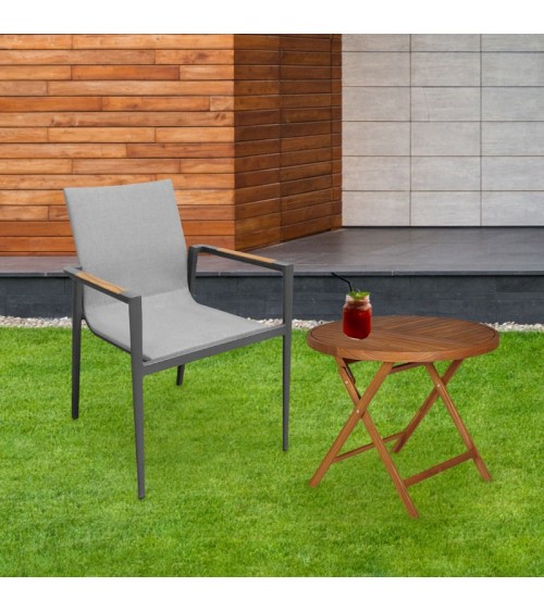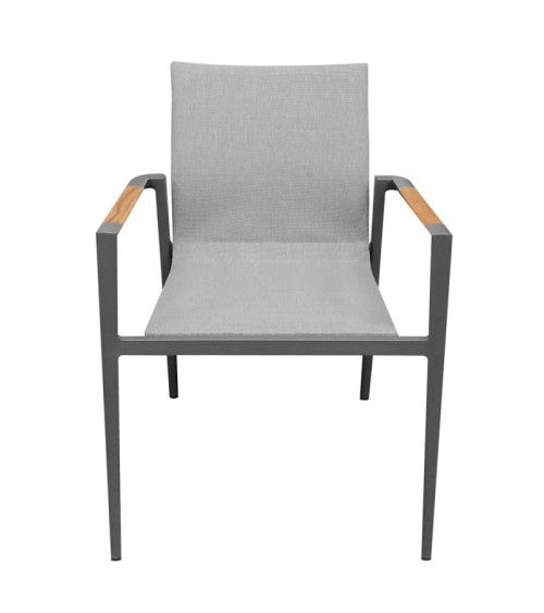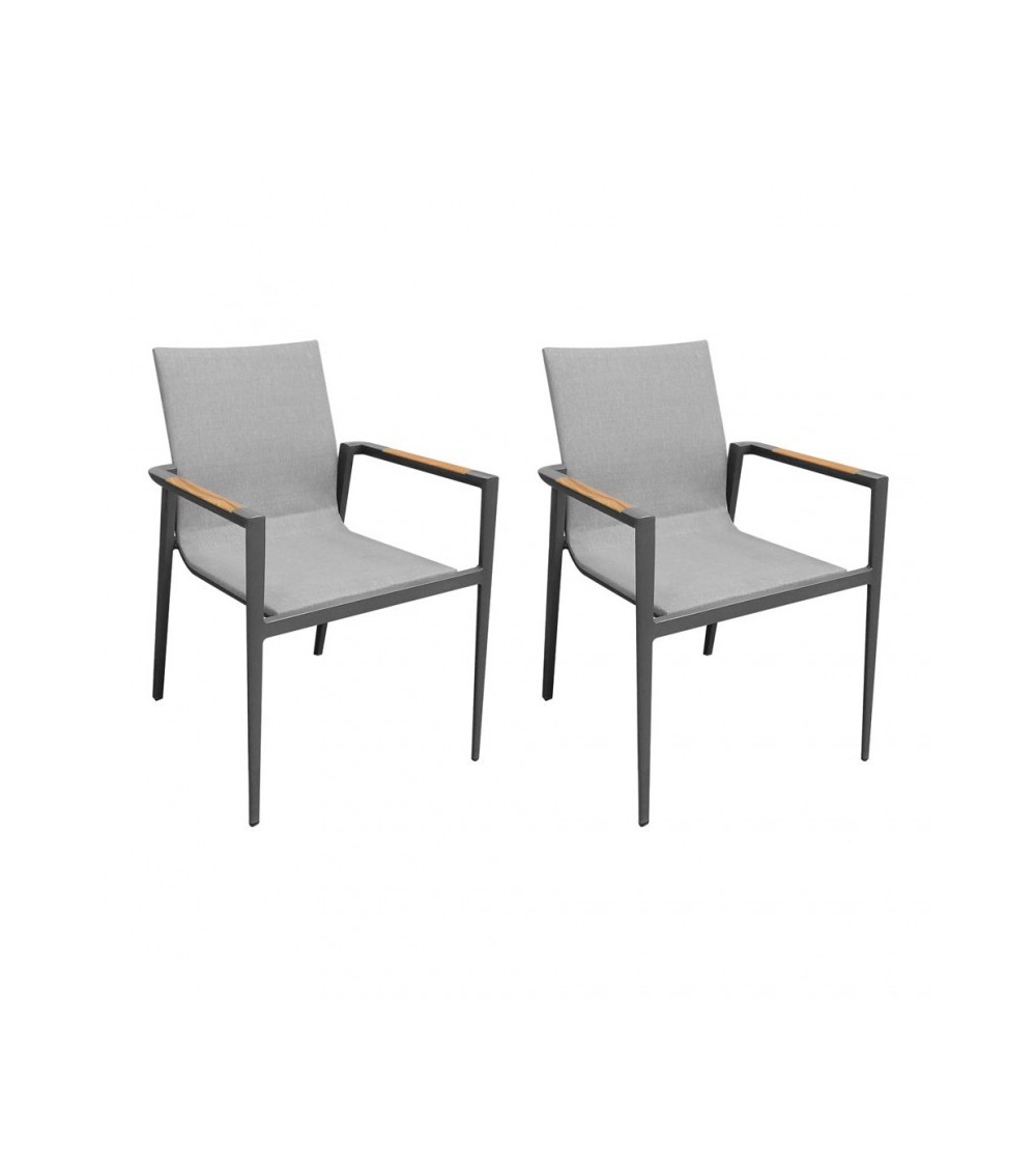 Optez pour le lot de 2 chaises de jardin LOKI. Cette chaise de jardin apportera une touche contemporaine à votre jardin ou sur votre terrasse grâce à son design élégant. Sa structure en aluminium apporte robustesse à cette chaise, les accoudoirs sont en teck et son revêtement en textilène est résistant aux UV, elle sera résistante et durable. Caractéristiques : PRODUIT : Lot de 2 chaises de jardin LOKI. COULEUR : Gris. COMPOSITION : Structure en aluminium. Revêtement tissu en textilène résistant aux UV. DIMENSIONS GENERALES APPROXIMATIVES : Hauteur 87 cm x longueur 56.5 cm x profondeur 59 cm. H. assise 42 cm. ATTENTION : La couleur de l'article peut légèrement varier par rapport au produit présenté sur la photo. ENTRETIEN : Nettoyer délicatement avec un chiffon doux et de l'eau. Ne pas utiliser de détergents, produits ou accessoires abrasifs. USAGE EXTERIEUR : Possible durant lété, et vivement conseillé de mettre à l'abris le produit lhiver. La société de livraison ne récupère pas les palettes.