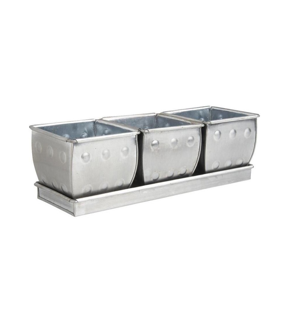 Aspect : Finition : BrosséMatériau principal : ZincDimensions : Hauteur (en cm) : 11,50Hauteur de la coupelle (en cm) : 3.00Longueur (en cm) : 36,00Profondeur (en cm) : 12,00Dimensions pot individuel : Hauteur (en cm) : 11,50Longueur (en cm) : 12,00Profondeur (en cm) : 12,00Autres caractéristiques : Nombre de pot : 3Poids (en kg) : 0,80 Jardinière 3 pots en zinc brossé